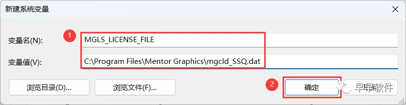 31、变量名输入:MGLS_LICENSE_FILE;变量值输入:C:\Program Files\Mentor Graphics\mgcld_SSQ.dat,再点击【确定】