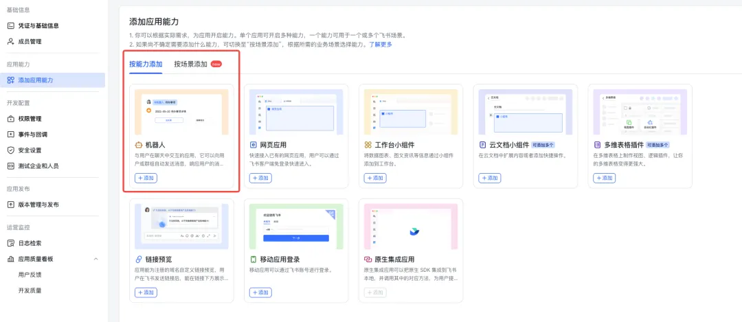 创建成功后进入应用详情页,左侧导航栏找到“添加应用能力”,点击后选择“机器人”,然后点击“添加”。