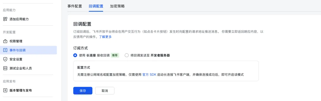 切换到“回调配置”页签,同样选择“使用长连接接收回调”,点击保存即可。这一步不是必须的,但建议配一下,让机器人功能更完整。