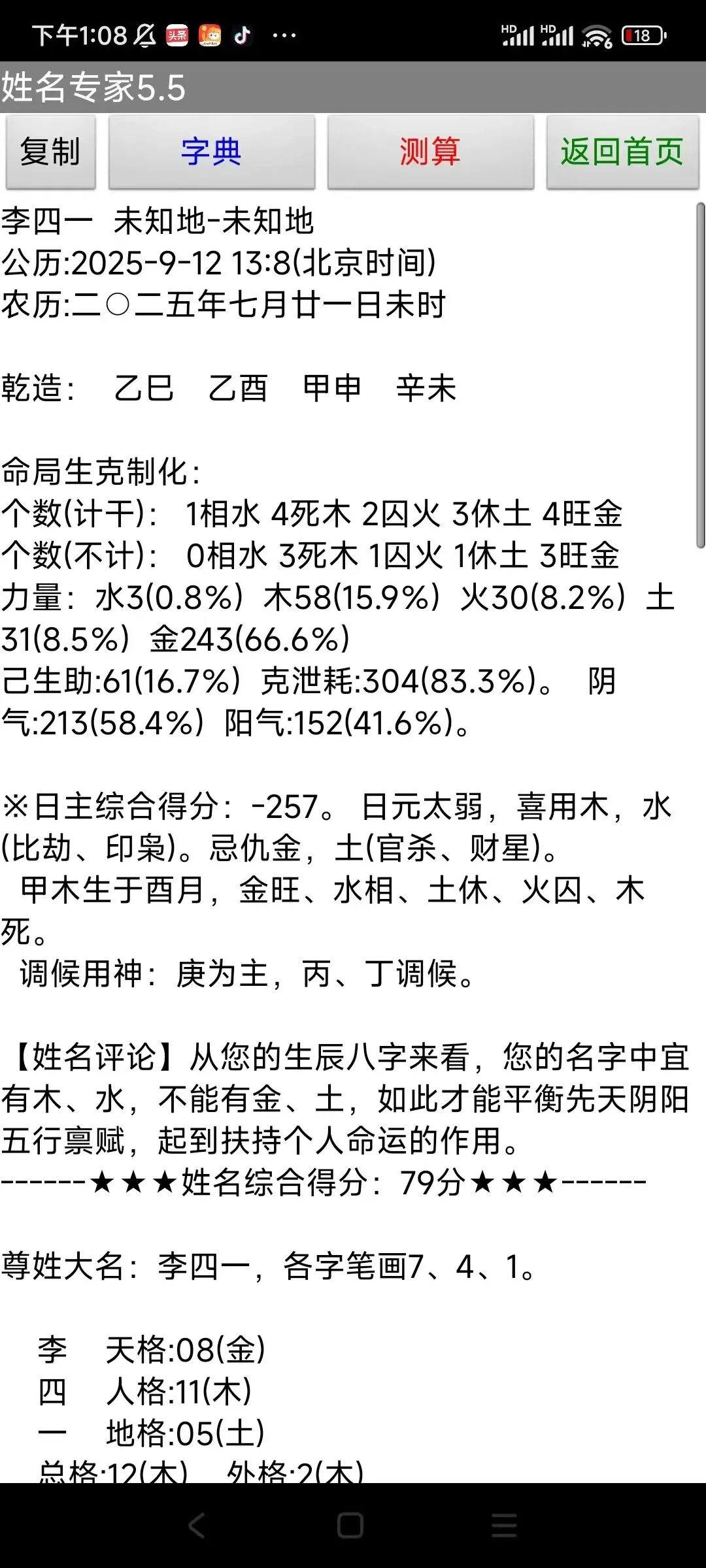 3:然后点“确定”按钮,就可以看到姓名结合八字的分析结果。