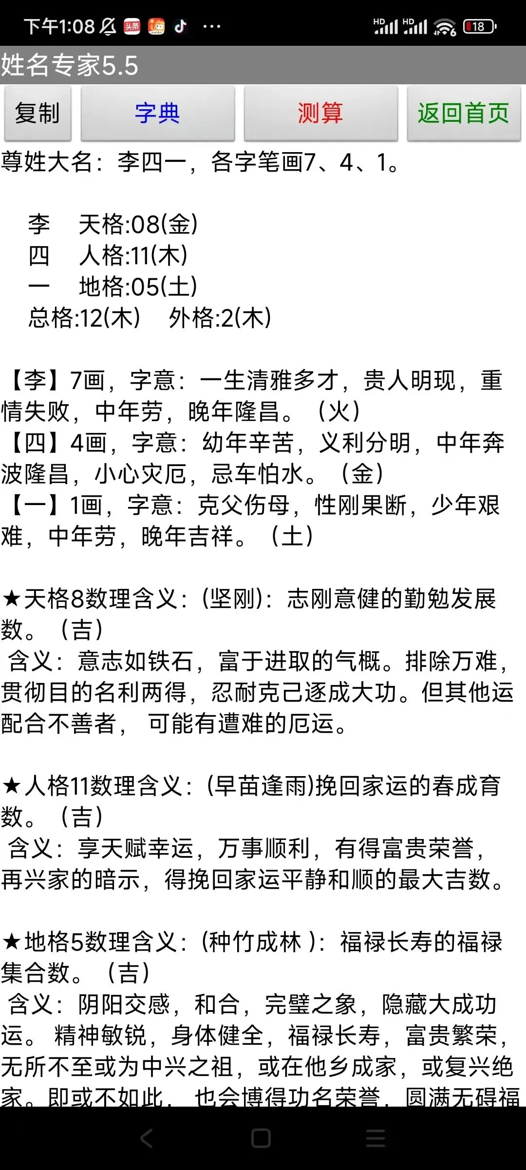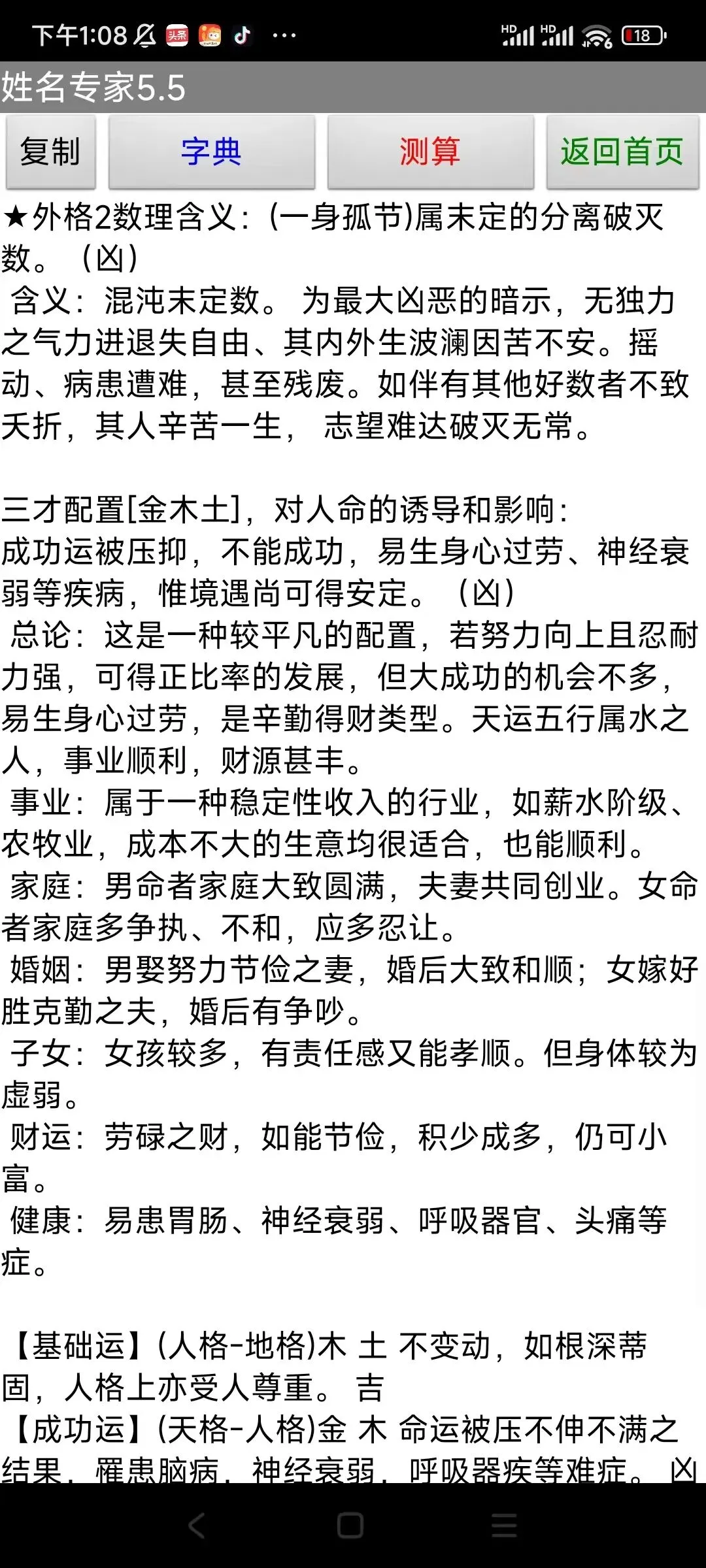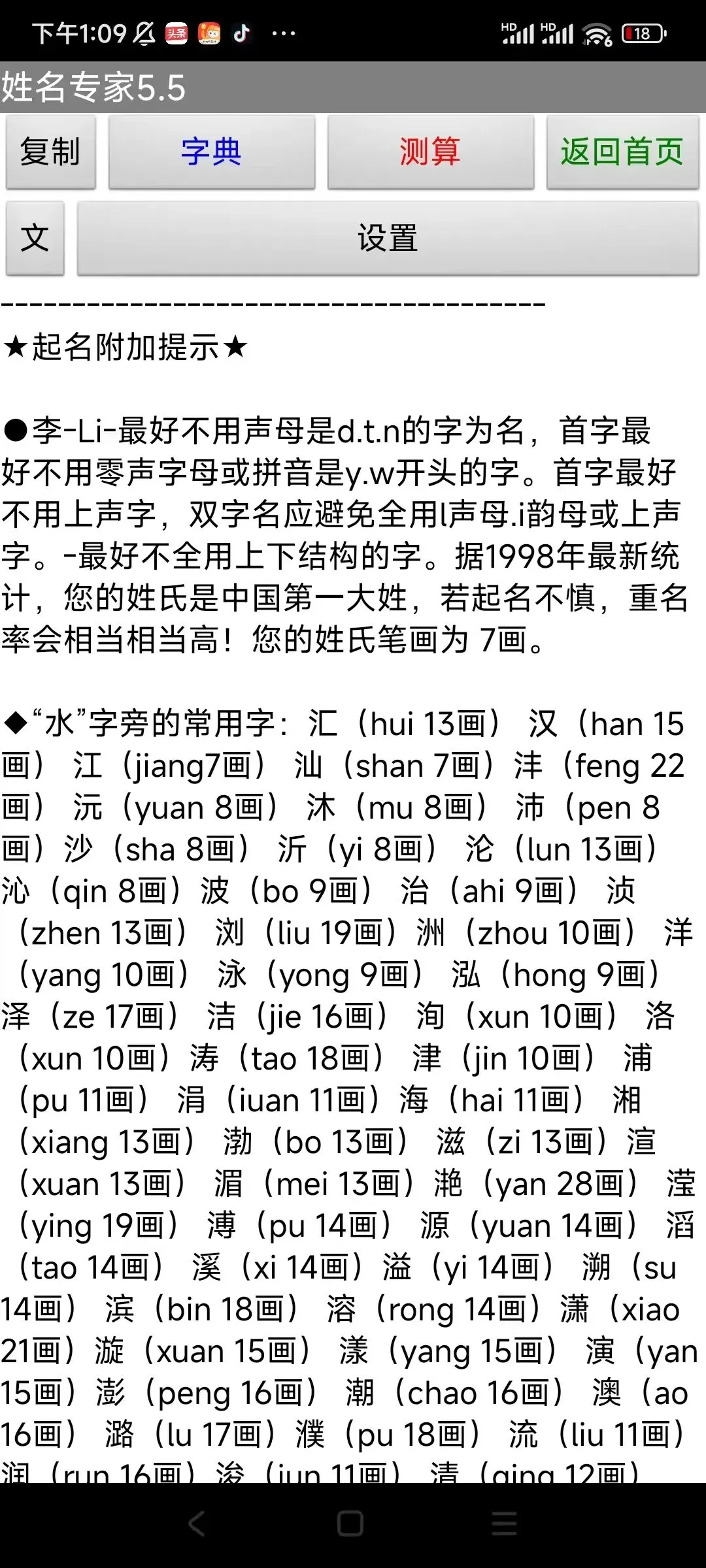提示1:点击“测算”按钮,进入姓名学字典,继续查字。