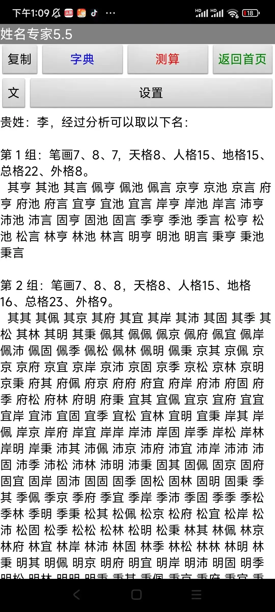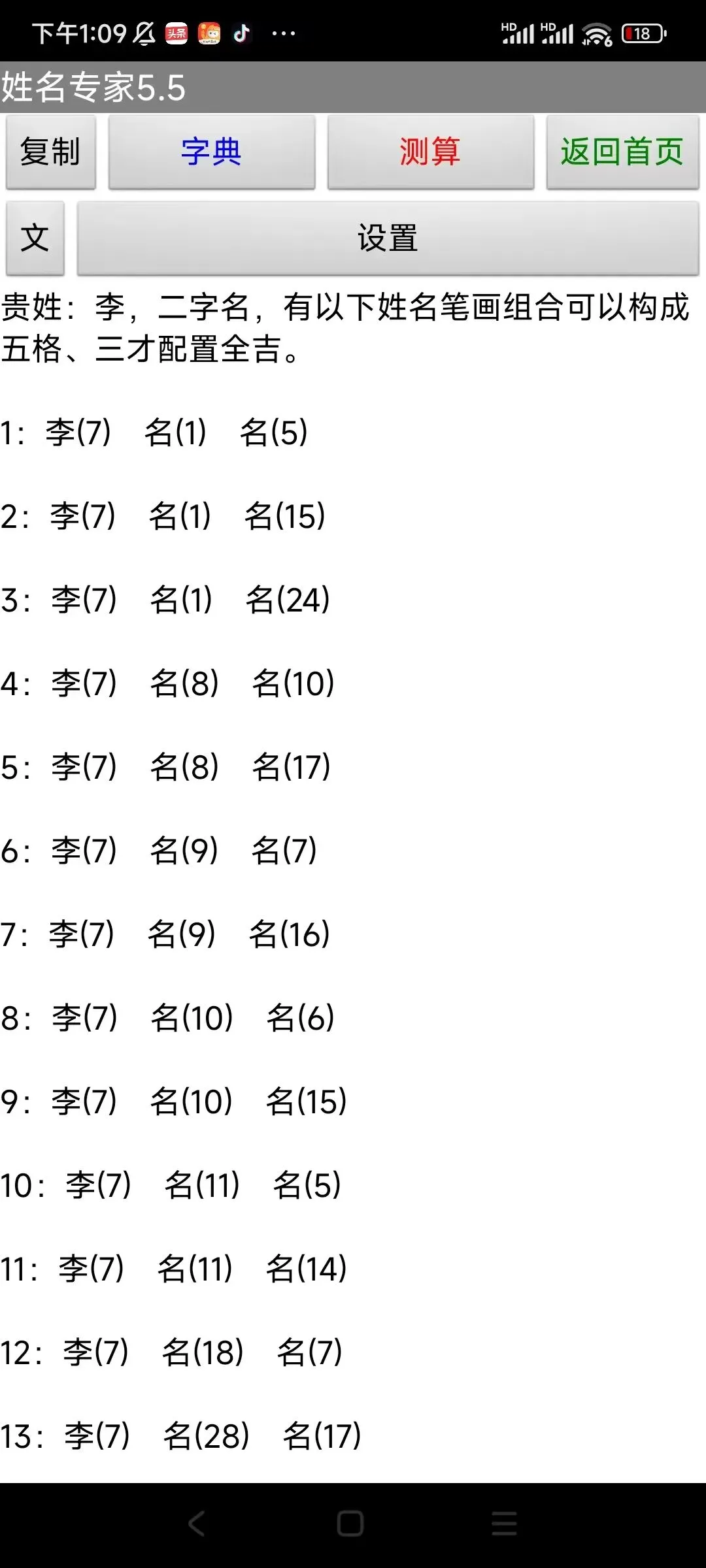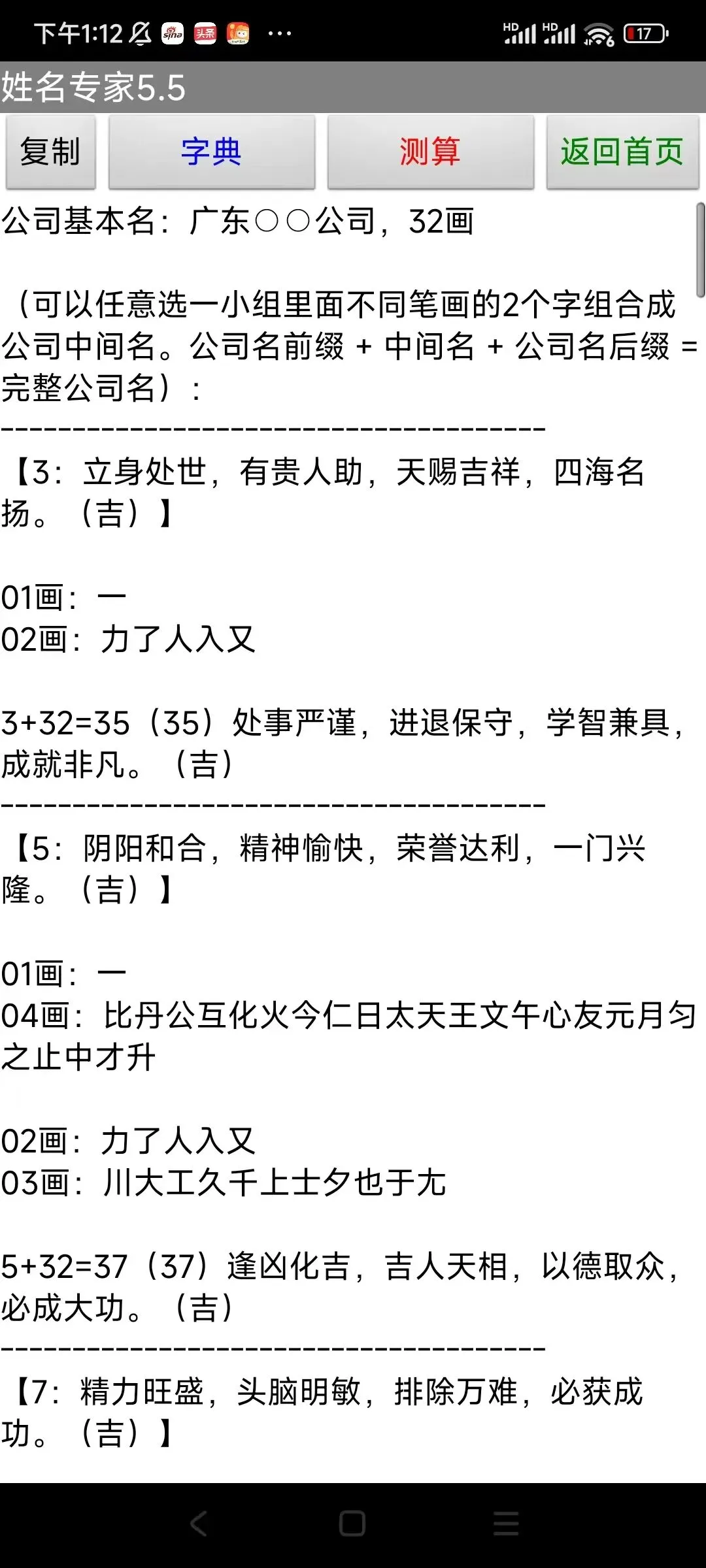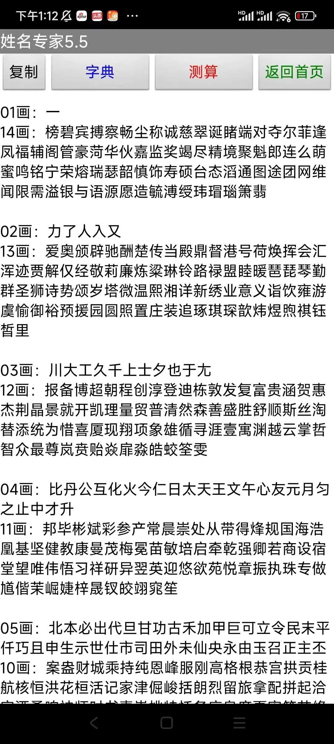 提示1:点击“测算”按钮,进入姓名学字典,继续查字。