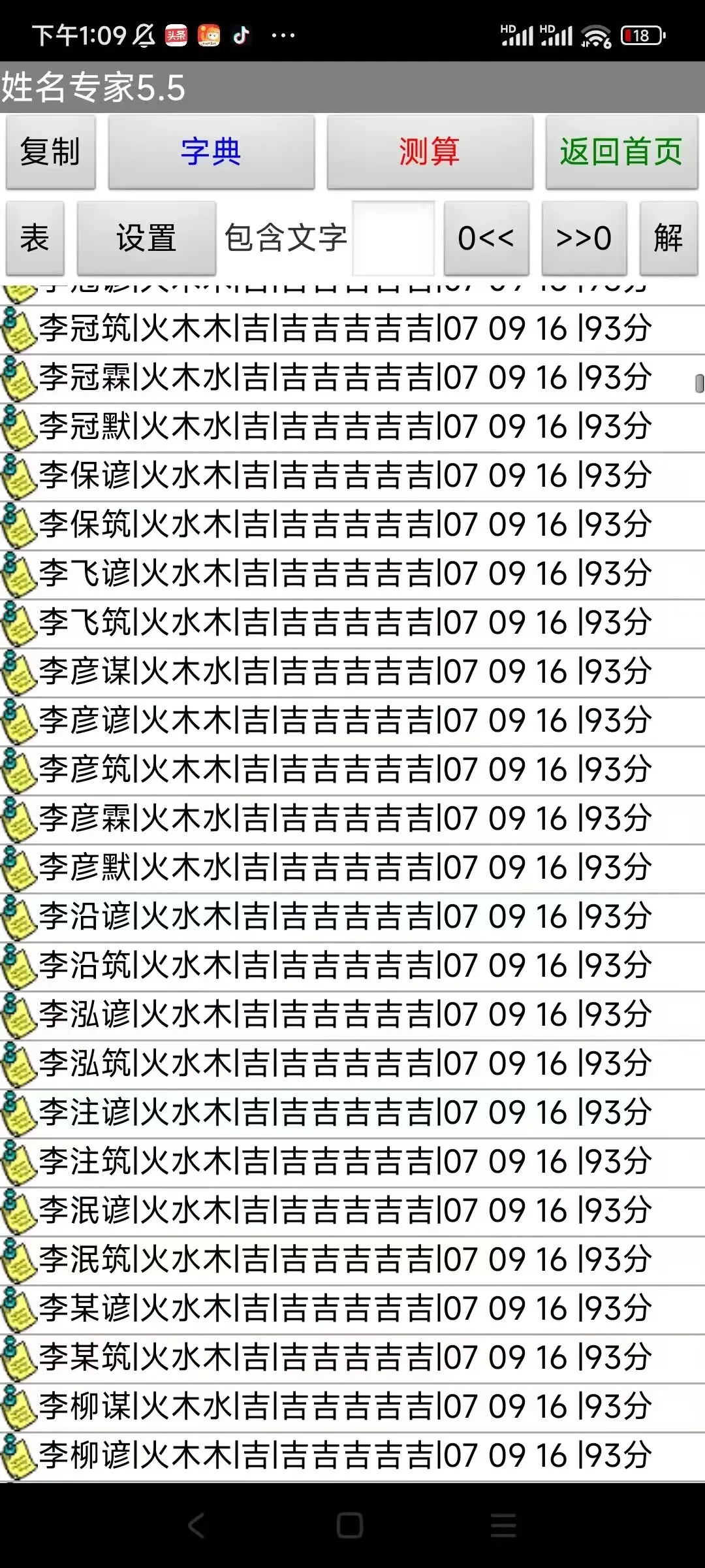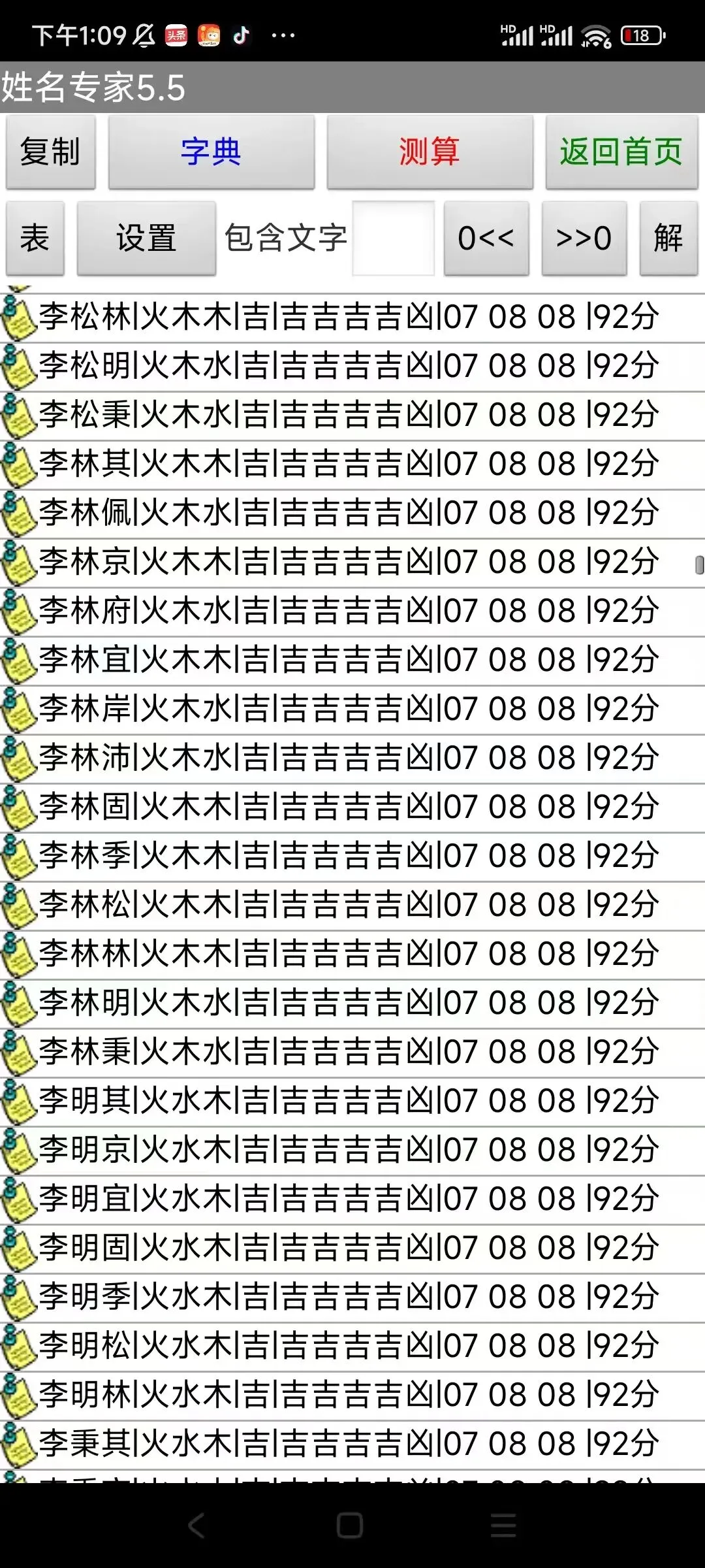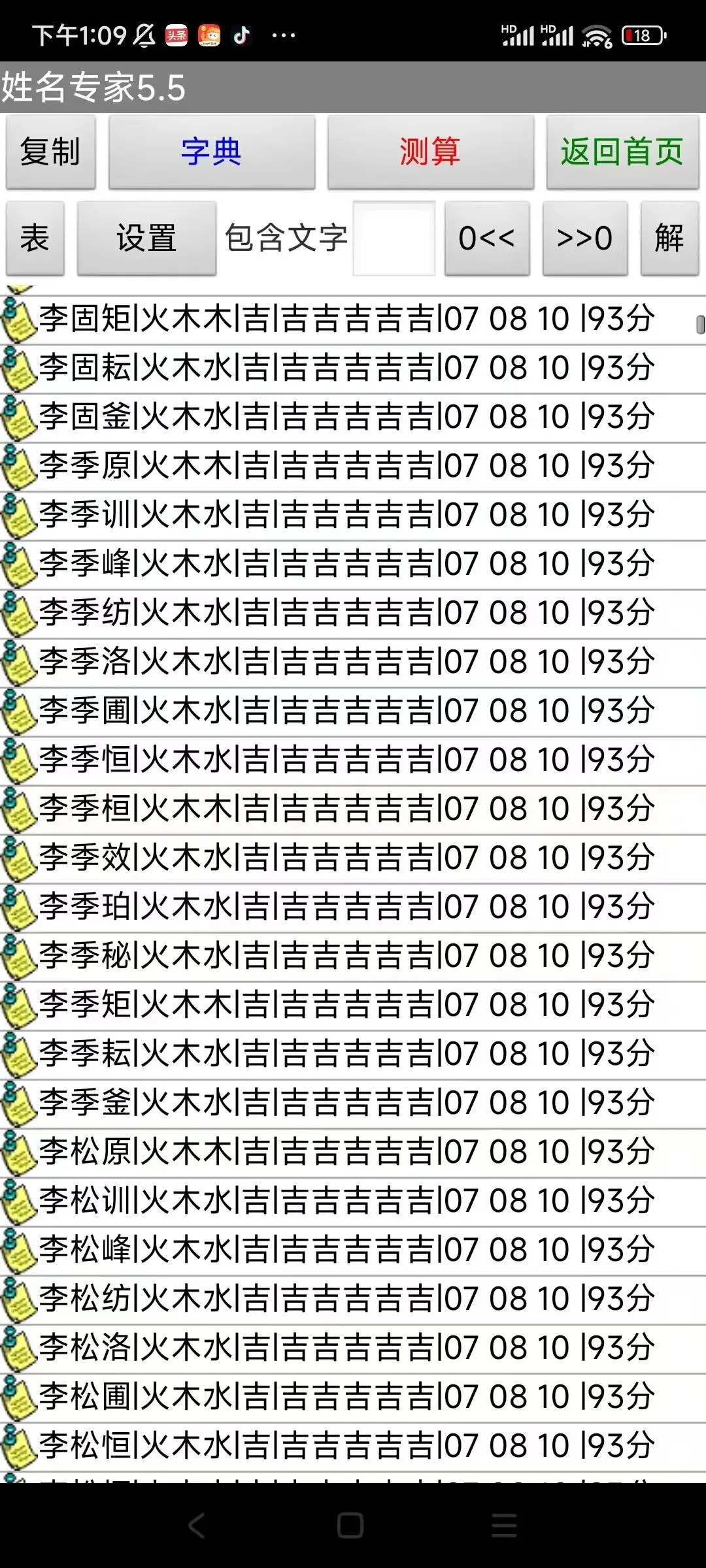 2:起出名字后,点击左上角的“表”或“文”按钮,切换列表、文本两种模式查看。列表模式下的姓名是按得分从高到低排序。