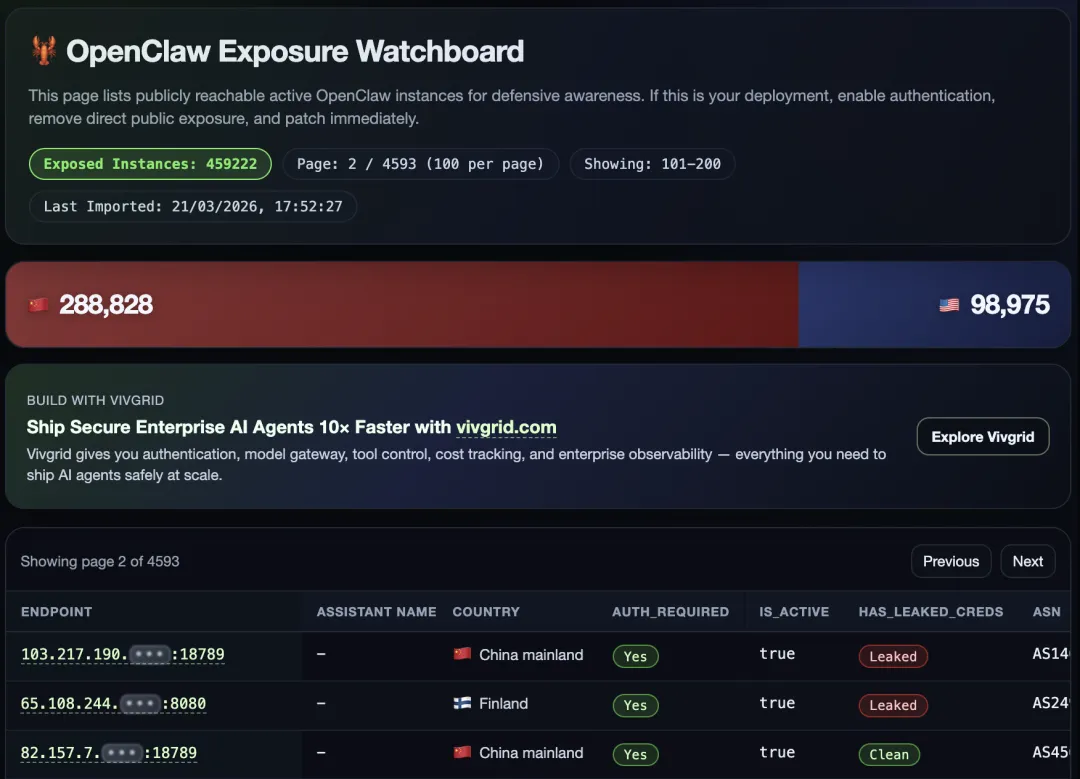 很多人以为风险离自己很远。然而,根据最新专注OpenClaw资产探测的互联网扫描平台 openclaw.allegro.earth 的数据显示,当前中国区域内有大量未经任何安全加固的OpenClaw实例直接暴露在公网上。 这些暴露的数据节点涵盖了个人宽带、云服务器乃至部分企业的商用IP。这意味着,攻击者无需任何复杂的内网渗透技巧,只需通过浏览器访问这些暴露的控制台,就能直接获取受害者设备的完全控制权,肆意窃取企业代码、财务报表,或将其作为跳板对企业内网发起“勒索攻击”。