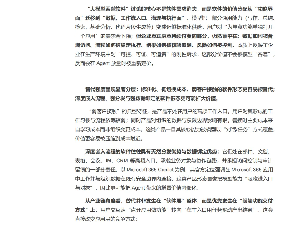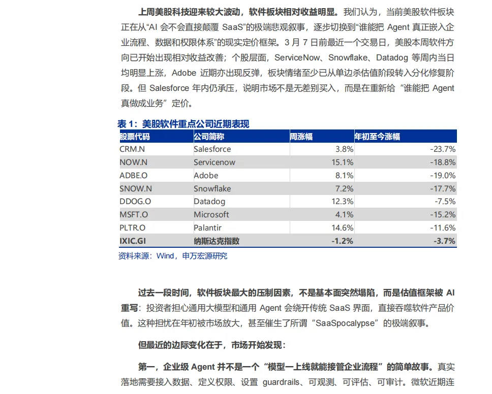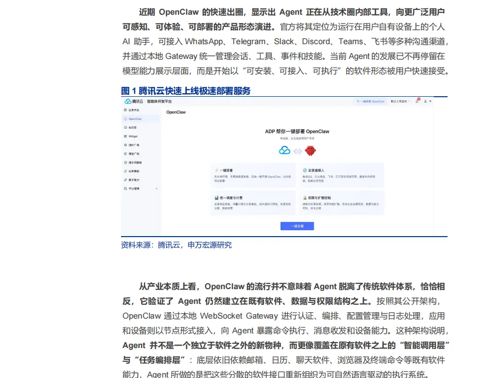 《Openclaw全球热议,软件从“吞噬”到“受益”》指出,美股软件板块摆脱“AI吞噬SaaS”的悲观预期迎来修复,ServiceNow、Datadog等周内大幅上涨,OpenClaw证实Agent是现有软件的智能调用与任务编排层,软件价值分化,标准化轻量工具易被替代,深度嵌入企业流程、占据高频入口的平台型软件核心受益,数字经济、AIGC应用与算力、数据要素等为核心投资主线。