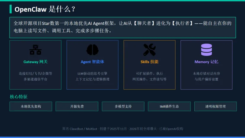 OpenClaw 是一款开源的本地自托管个人 AI 智能体(Agent)平台,前身为 Clawdbot/Moltbot。其核心是基于 TypeScript 开发的命令行应用,持续运行在用户自有硬件上,可执行 shell 命令、管理文件并协调多步骤工作流程。它将 AI 模型(大脑)与本地执行环境(身体)彻底解耦:对话记录、工具执行、会话状态等调度逻辑全部保留在用户自己的设备上。通过单一Gateway网关进程,可同时连接 WhatsApp、Telegram、飞书等多种聊天平台,实现跨渠道统一交互。