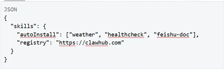 编辑配置文件~/.openclaw/openclaw.json,添加skills配置,在重启OpenClaw后自动安装。