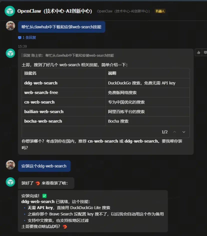这里选择飞书作为渠道,只需要使用自然语言的方式,让Open Claw帮忙安装需要的Skills。