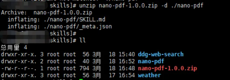 把第1步下载到的zip包上传到安装OpenClaw的机器,目录为~/.openclaw/skills,使用unzip命令解压Skill包到对应的目录下。