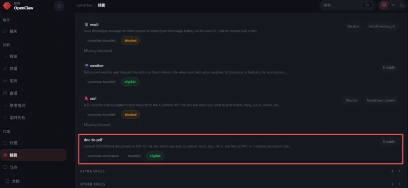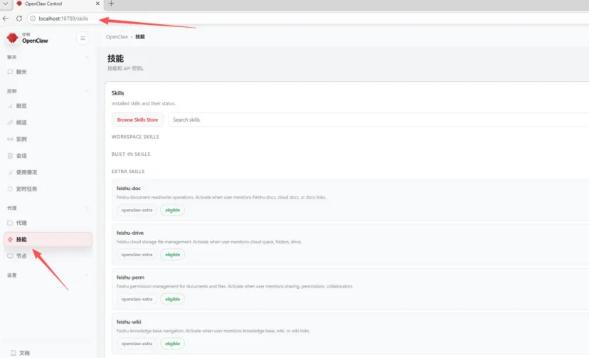 上面包含三块Skill:Workspace Skills、Built-in Skills、Extra Skills。