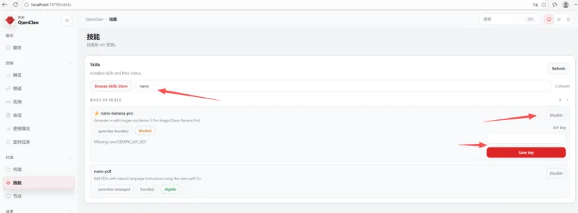 在上面搜索已经安装的skill,可以失效不需要的skill,或者更改skill使用的api_key。