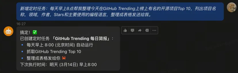 我们与通过飞书机器人对话,向 OpenClaw 下达如下指令: