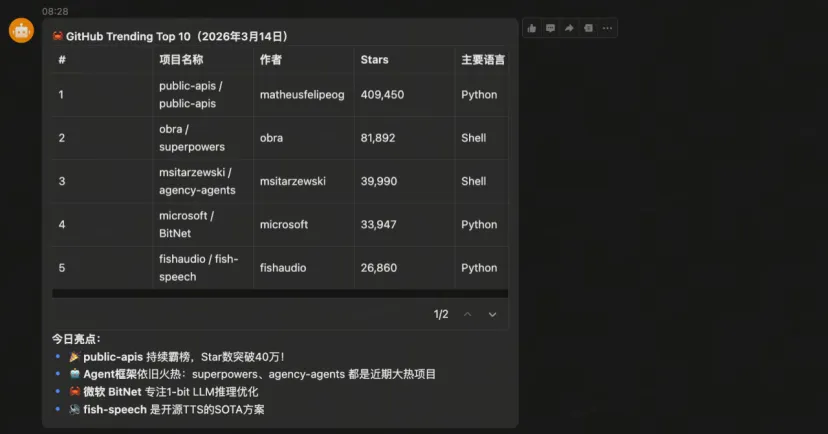每天早上八点,把Github当下最热门的前5个开源项目,整理成报告。