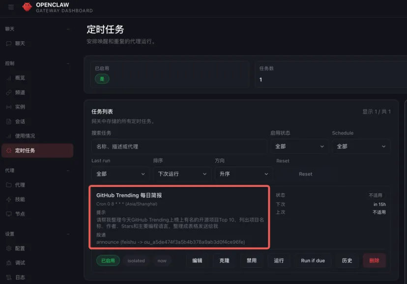 在终端输入 openclaw dashboard 打开 OpenClaw Gateway 界面,切换到“定时任务”之后确认刚刚的定时任务是否已经创建: