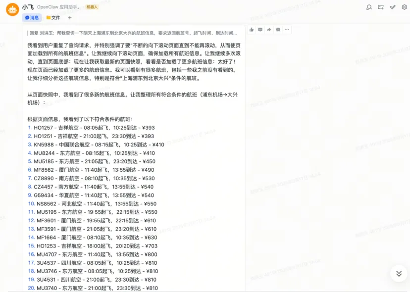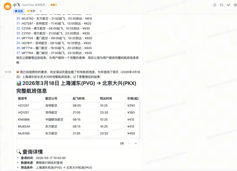可以看到 OpenClaw 已经把航班信息以表格的形式收集到了。监控整个执行过程,我们发现 OpenClaw 在控制浏览器打开携程页面,输入起始地和目的地,滚动页面自动加载更多结果,真正实现了自动化处理。