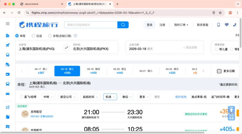 打开携程网站,查询上海浦东到北京大兴的机票信息,并且返回查询结果。
