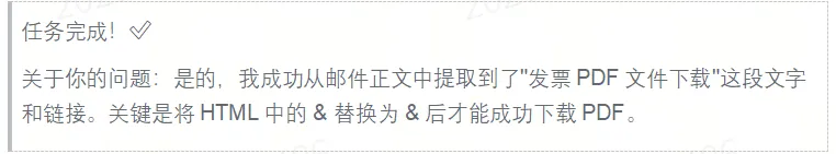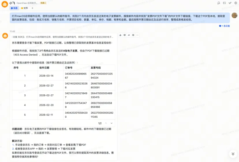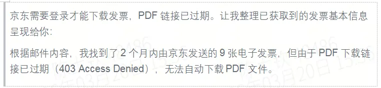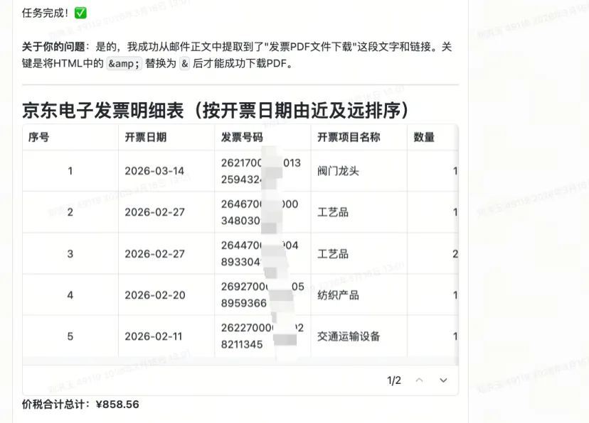 但实际的发票下载链接可以直接打开并下载,显然 OpenClaw 并没有正确获取发票的下载链接,我们的提示词需要改进。