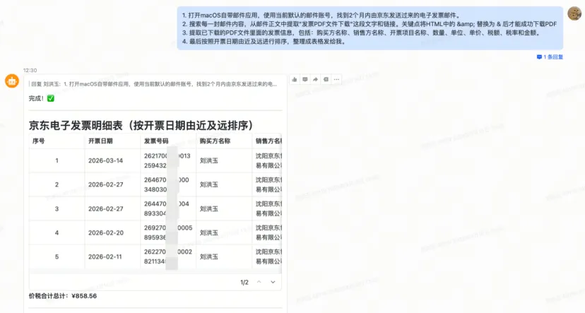 再次检查结果发现 OpenClaw 已经成功提取了两个月内的 PDF 发票中的信息。