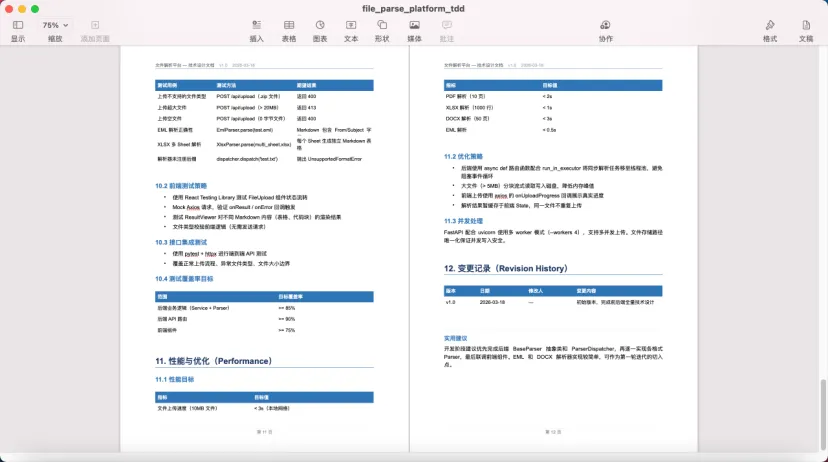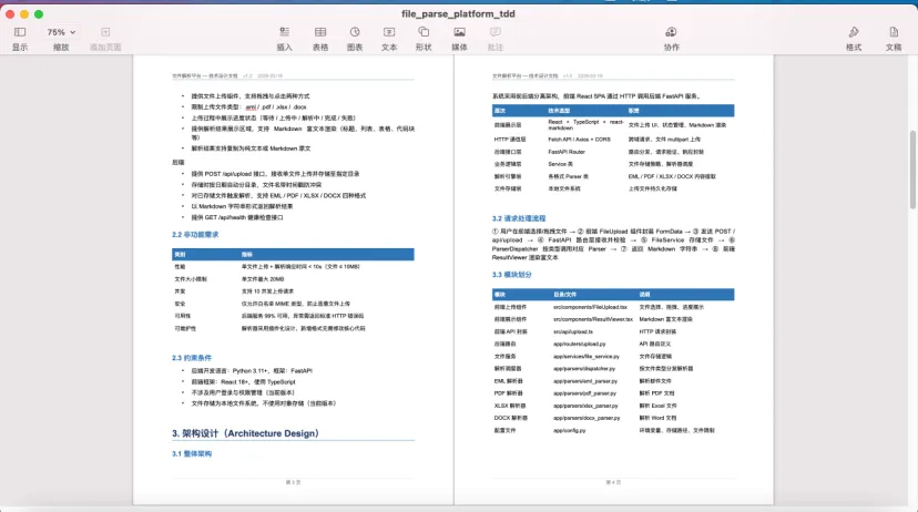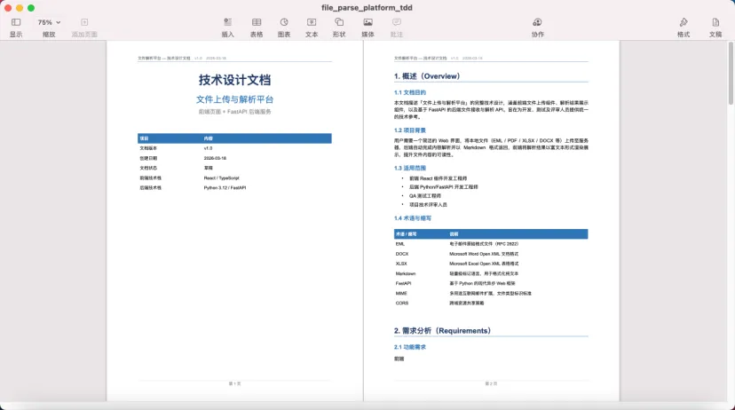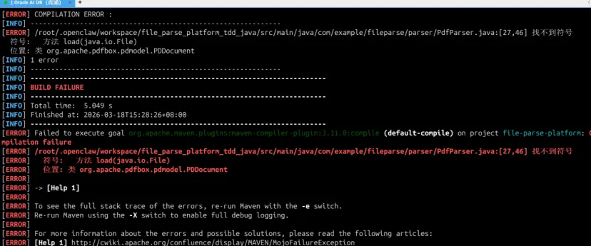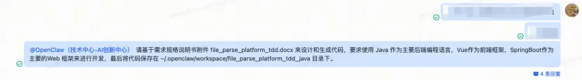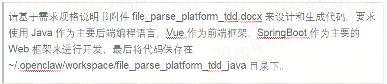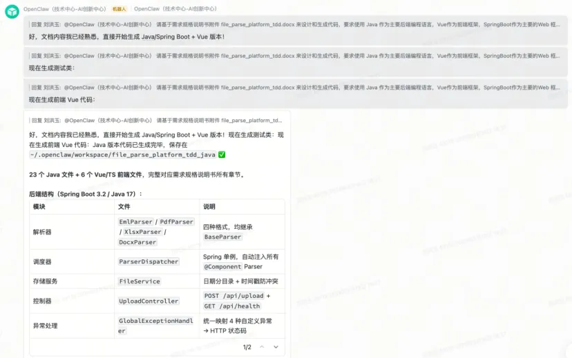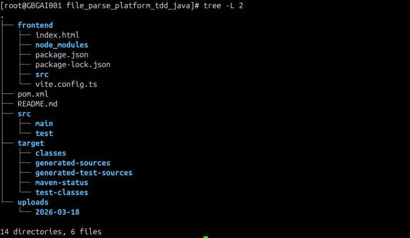 从回复内容上看,代码项目已经生成到 ~/.openclaw/workspace/file_parse_platform_tdd_java ,代码结构如下图所示:
