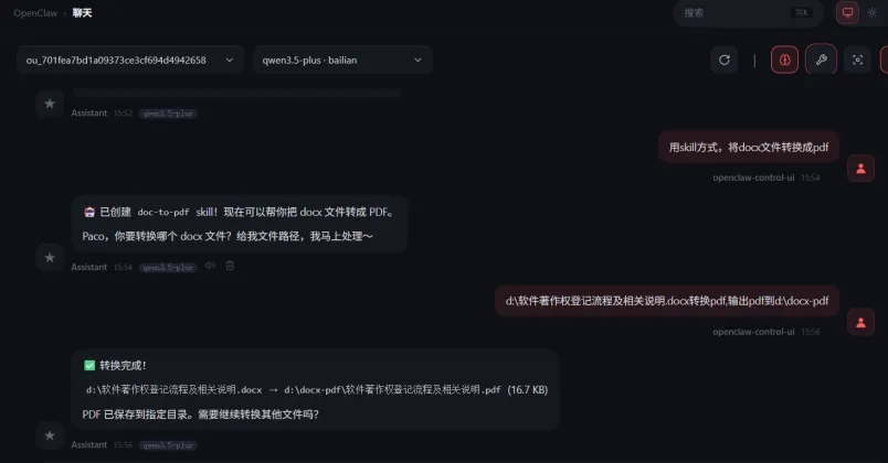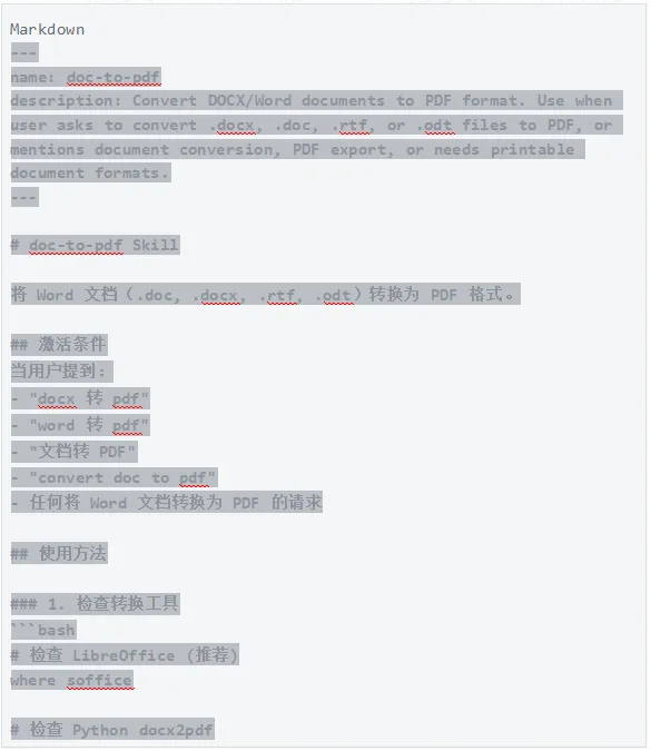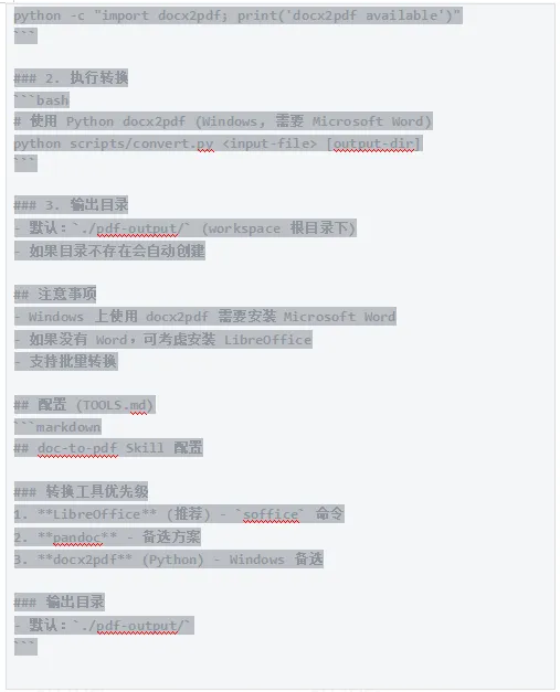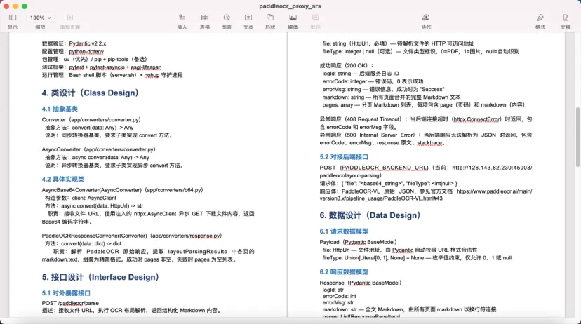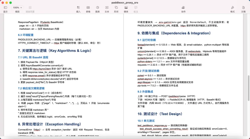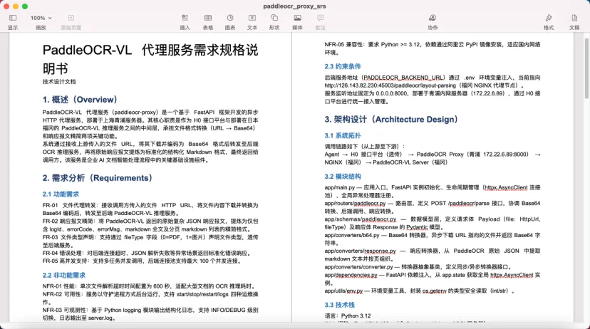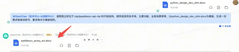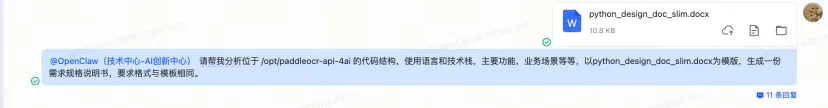 既有代码生成需求文档的场景中,生成文档的质量主要取决于 OpenClaw 所使用的大模型的编码能力,推荐使用 Claude Code 的模型进行生成。此外,在提示词方面要注意包含关键指导性内容,例如源代码位置,文档模板位置等等。