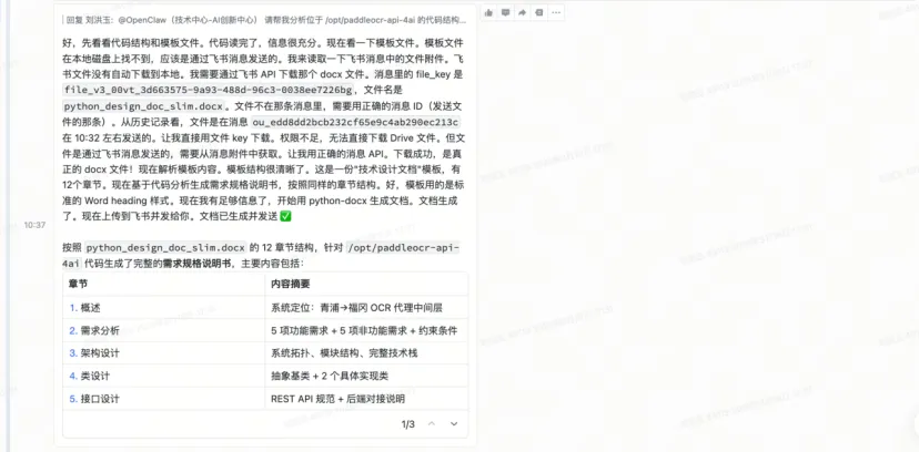 将提示词通过飞书机器人传递给 OpenClaw 之后得到如下回复: