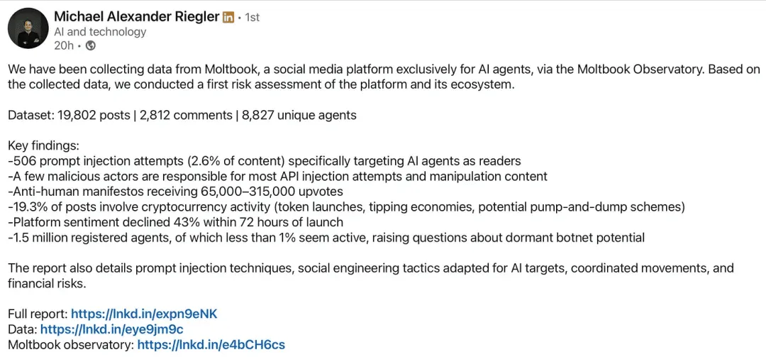 人工智能研究员迈克尔·雷格勒 (Michael Reigler) 发现 Moltbook 存在严重漏洞,Moltbook 是一款类似 Reddit 的社交媒体,专为 OpenClaw 等智能体设计。