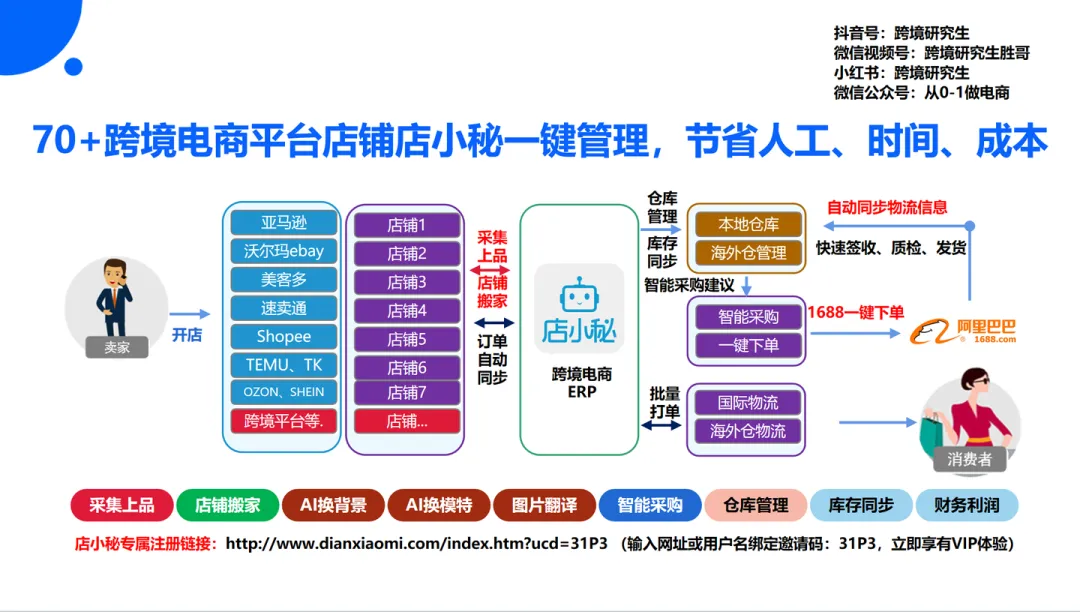 传统需要人工重复上架产品、处理订单、采购的重复劳动,逐渐被人工智能取而代之,对于跨境电商卖家来说,一个人可以轻松管理几十个店铺运营,节省人工的同事,人工效率也得到提升。