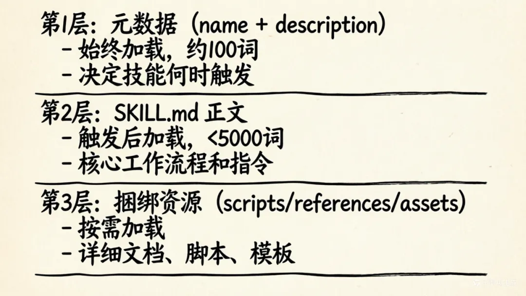 my-skill/├── SKILL.md # 必需:核心指令文件(<500行)├── scripts/ # 可选:可执行脚本├── references/ # 可选:详细参考文档└── assets/ # 可选:模板、图片等资源4.2 渐进式加载机制