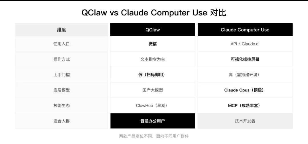 面向不同用户:QClaw 适合想用 AI 提效但不想折腾技术配置的普通办公用户;Claude Computer Use 更适合有技术背景、需要深度自动化的开发者。