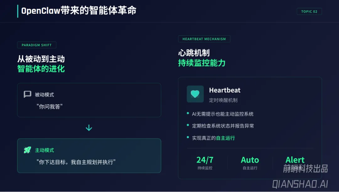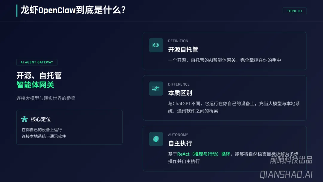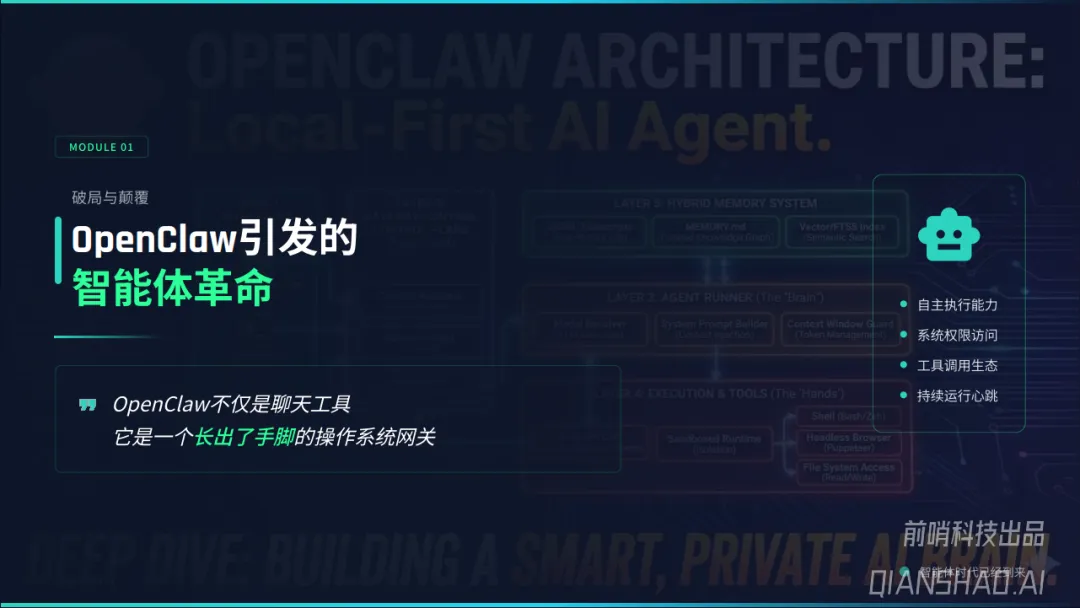 OpenClaw作为连接大模型与现实世界的智能体网关,以开源自托管为核心特征,凭借网关、Agent大脑、Memory记忆、Channels通道、Skills技能五大组件协同,实现自主执行、持续监控等核心能力,在研发运维自动化、商业情报采集、具身智能控制等场景展现出颠覆性生产力。其引发的智能体革命,使AI从“被动对话”转向“主动执行”,但同时也因架构特性成为安全高危领域,多家科技巨头及高校、政府机关已出台封杀禁令。