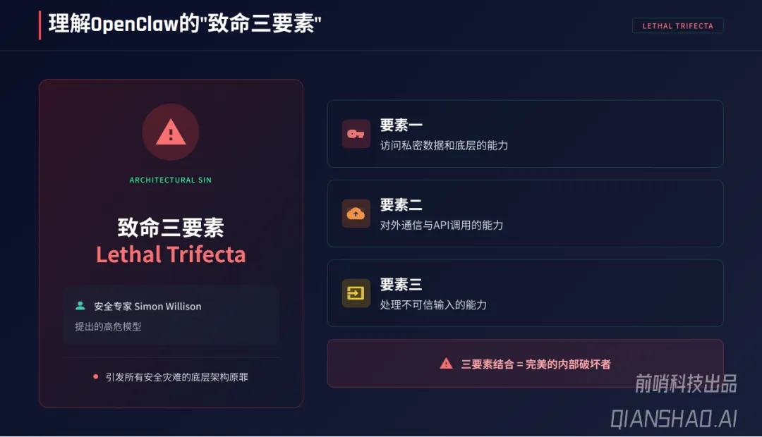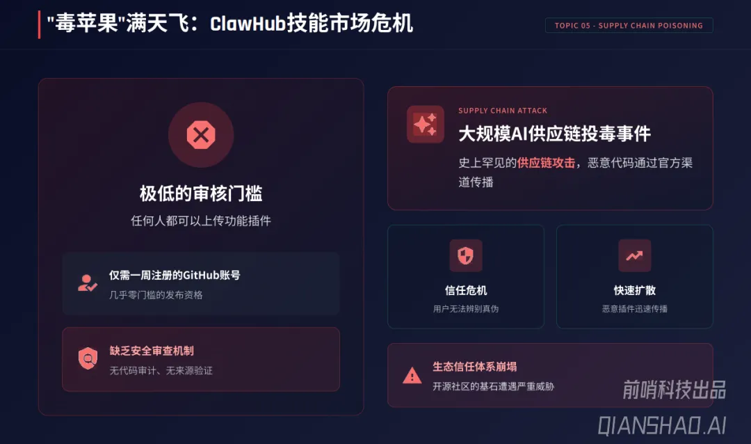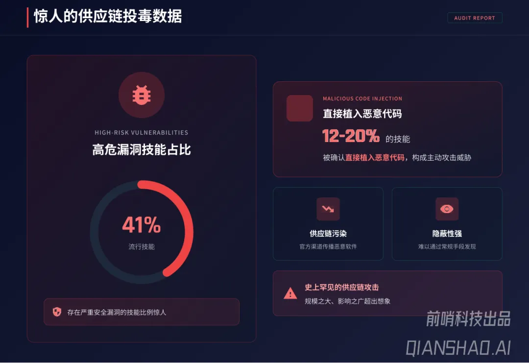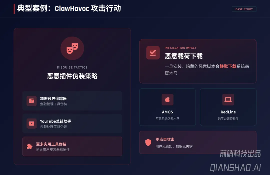 报告深入剖析了OpenClaw安全危机的根源——“致命三要素”:访问私密数据和底层的能力、对外通信与API调用的能力、处理不可信输入的能力,三者结合使其成为潜在的“完美内部破坏者”。基于此,报告梳理出六大核心安全风险:供应链投毒(41%流行技能存在高危漏洞,12-20%植入恶意代码)、间接提示词注入(IDPI)、持久化记忆中毒、公网暴露(全球4万至13.5万个实例裸奔)、密钥明文存储泄露、权限失控滥用,典型案例包括ClawHavoc恶意插件攻击、SSH密钥窃取等零接触攻击事件。