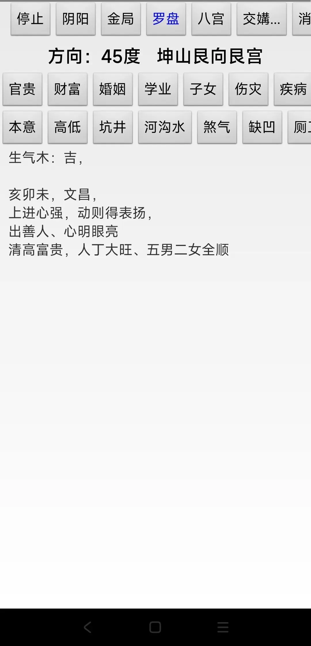除了罗盘还有玄空飞星排盘。及以下各方面的风水判断秘决:官贵、财富、婚姻、学业、子女、少亡、官司、牢狱、人品、寿元、伤灾、疾病、本意、高低、坑井、河沟水、煞气、缺凹、厕卫、灶窑、电器、坟庙、镜金、杂项等。