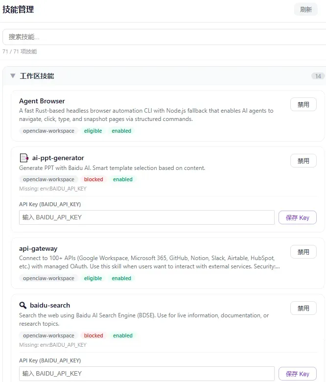 打开侧边栏“技能商店”,像管理手机App一样一键启用或停用技能,无需任何命令行操作。如需调用外部API(如信息抓取、自动生成PPT),直接在技能卡片下方填写专属Token并保存,系统将自动检测环境状态,绿灯亮起即可使用,告别“盲盒式”报错。