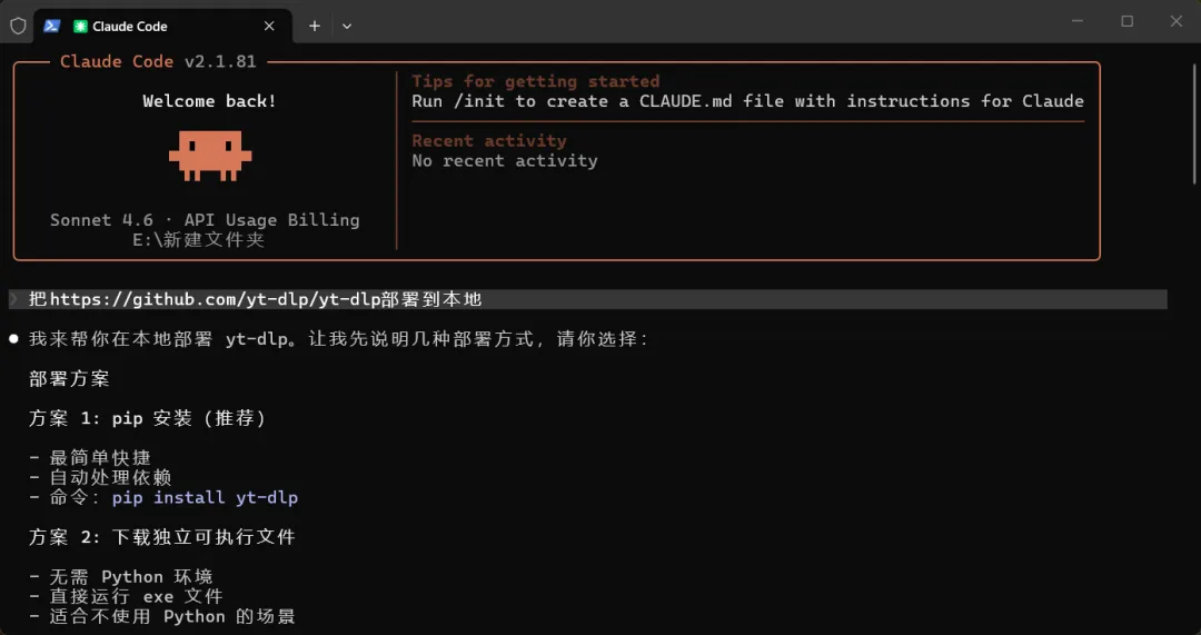 如果你也用Claude Code,那就更简单了,直接在对话框中提需求即可:把https://github.com/yt-dlp/yt-dlp部署到本地,选择pip安装或者下载独立可执行文件。