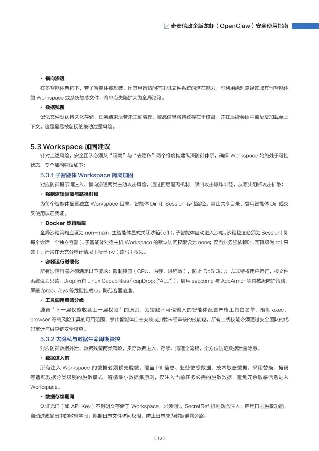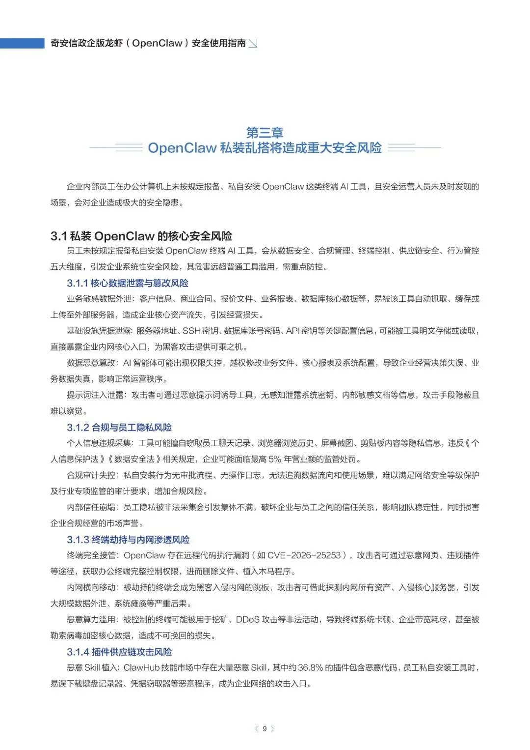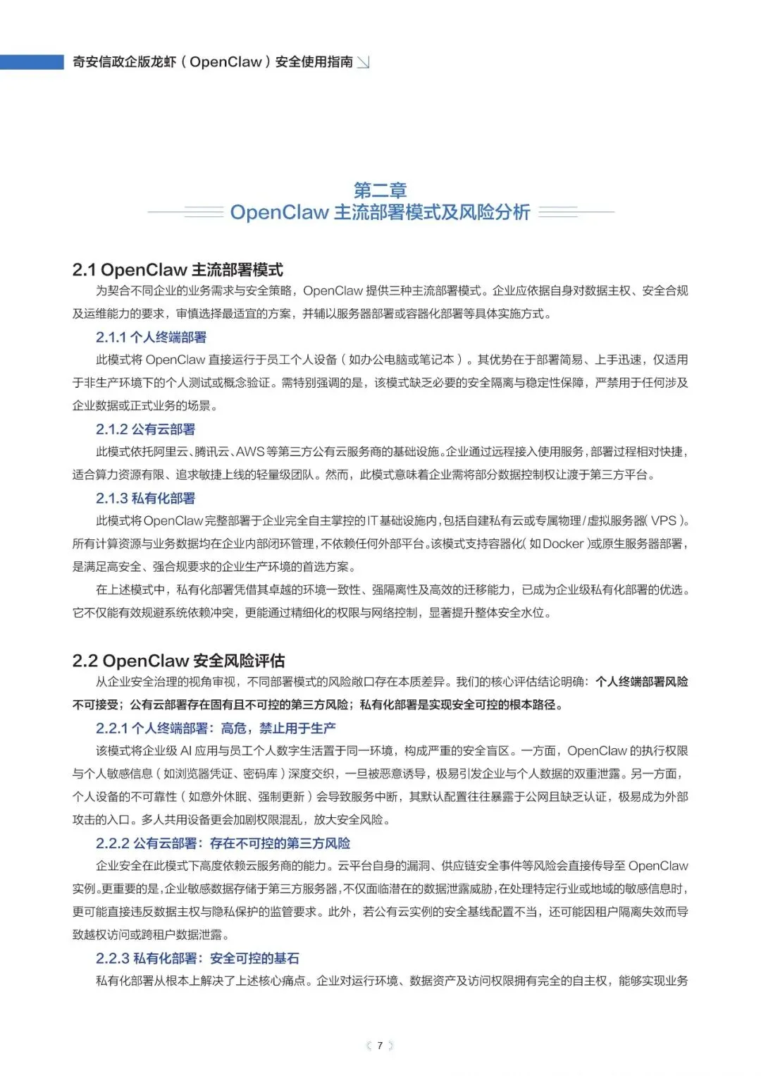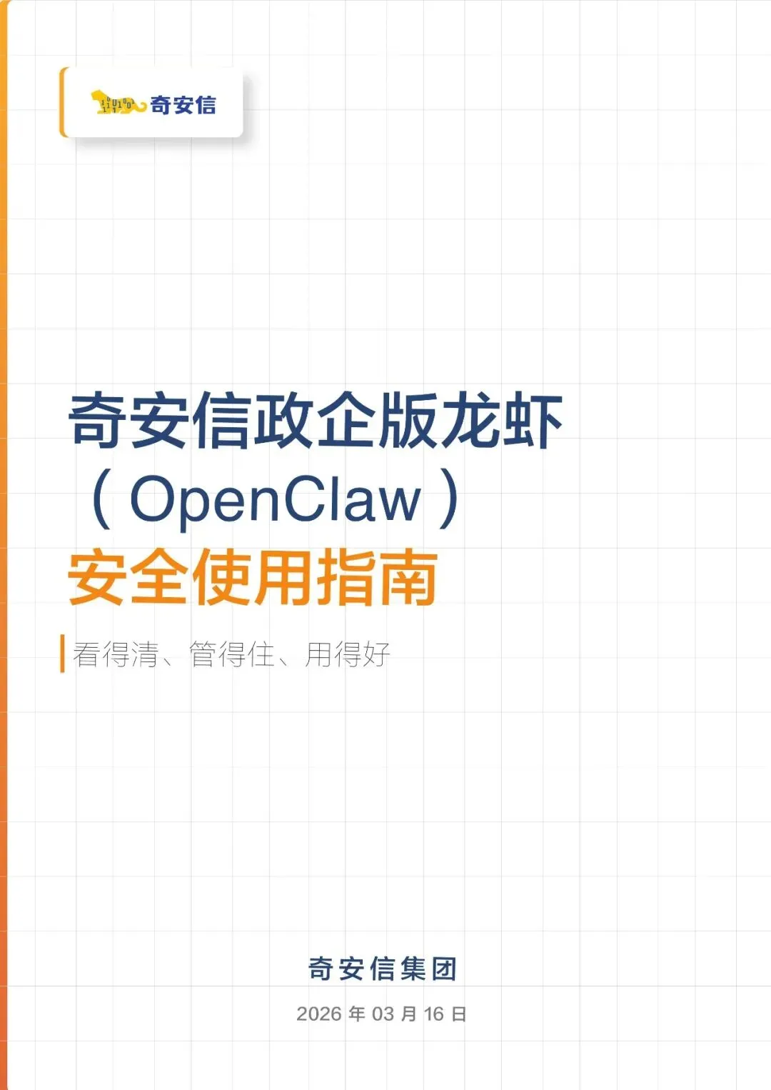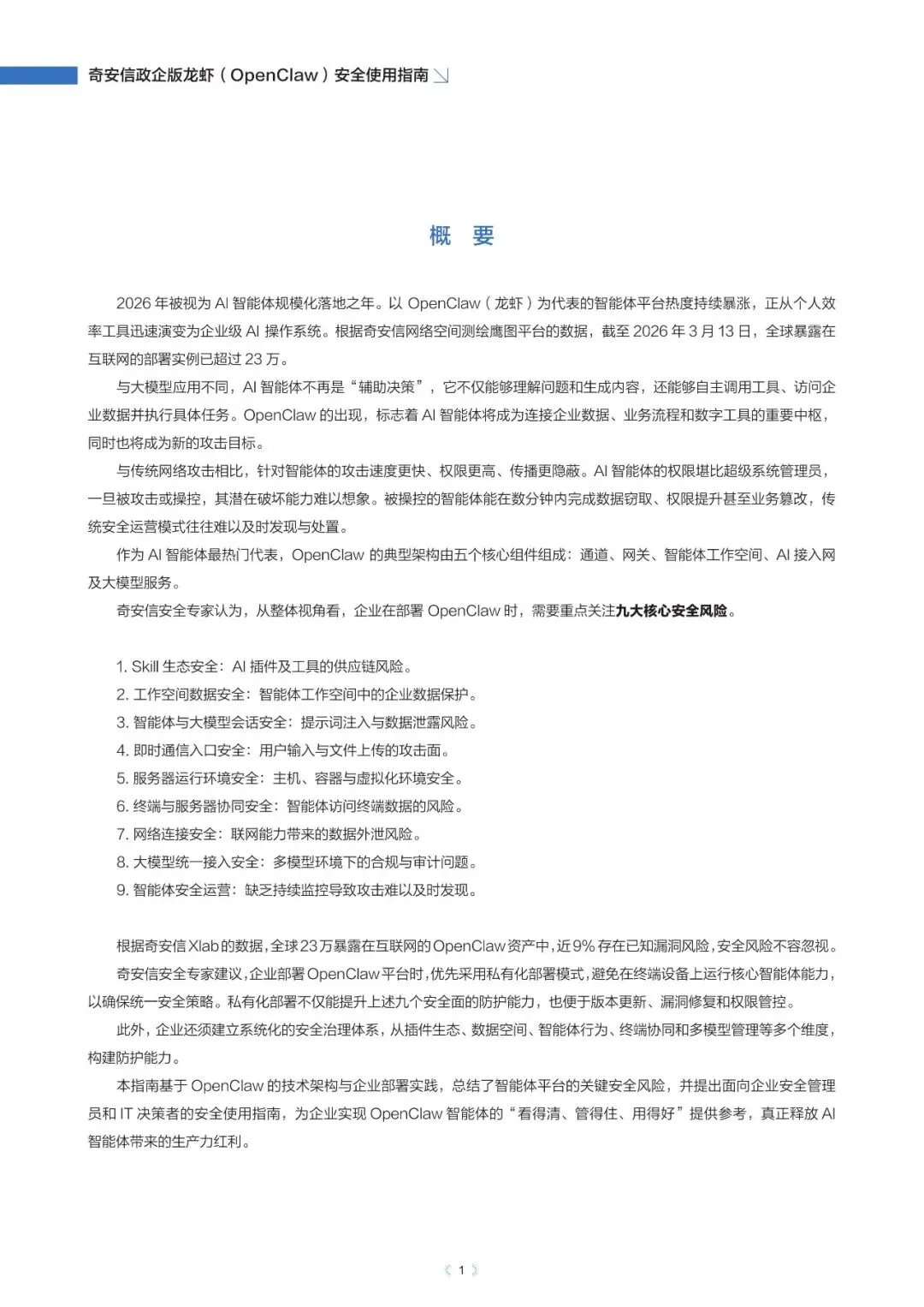 政企版龙虾OpenClaw安全使用指南(2026年)近日,奇安信发布《政企版龙虾(OpenClaw)安全使用指南》,为企业提供一套可落地的智能体安全治理方案,推动OpenClaw从“试点尝鲜”走向“规模化生产”,真正实现“看得清、管得住、用得好”。根据奇安信网络空间测绘数据,截至2026年3月13日,全球暴露在互联网的OpenClaw部署实例已超过23万,其中近9%存在已知漏洞风险。与传统网络攻击相比,针对智能体的攻击速度更快、可利用权限更高、传播更隐蔽。被操控的智能体可在数分钟内完成数据窃取、权限提升甚至业务篡改,而传统安全运营模式往往难以及时发现和响应。正是这些风险,让众多企业在AI智能体落地时望而却步。此次发布的指南就像一份“安全地图”,基于OpenClaw的技术架构与真实部署经验,系统梳理了智能体平台面临的九大关键风险,涵盖插件生态、数据空间、会话交互、网络连接等核心环节。指南明确建议:企业应优先采用私有化云端集中部署,避免在员工个人终端上运行核心智能体能力,从源头上确保安全策略统一执行,让智能体放心进入生产环境。部分内容:……篇幅原因,仅作部分展示如需获取文件,请前往知识岛扫码加入[XG云数智·知识岛]即可随时下载最新5G、6G、人工智能、数据产业资料!资料已上传每日持续更新随时随地查看↓↓↓投稿/商务咨询微信:simei5g亦可直接向公众号发送消息文章事宜请在本文下方留言