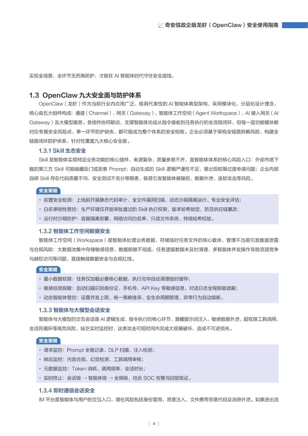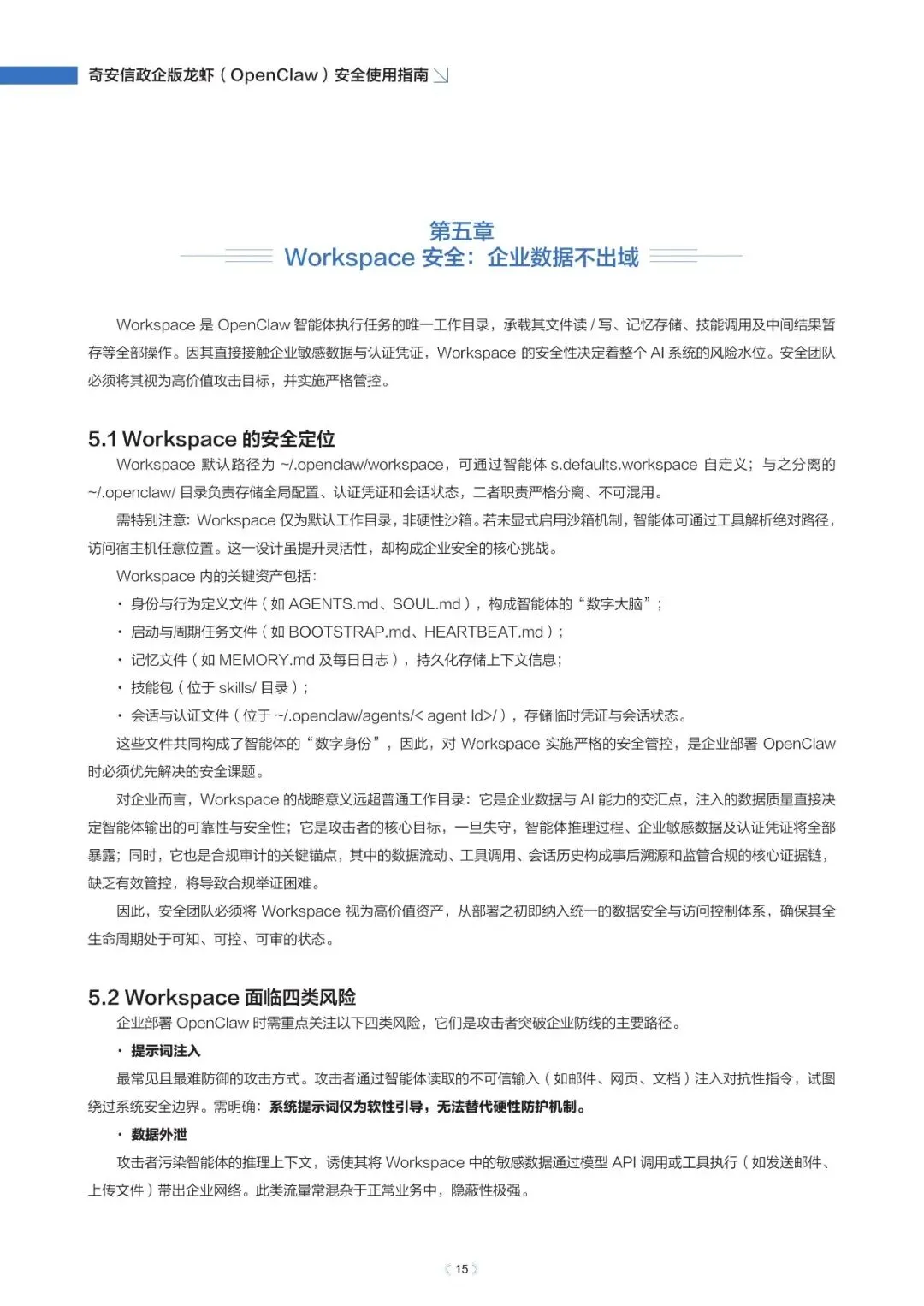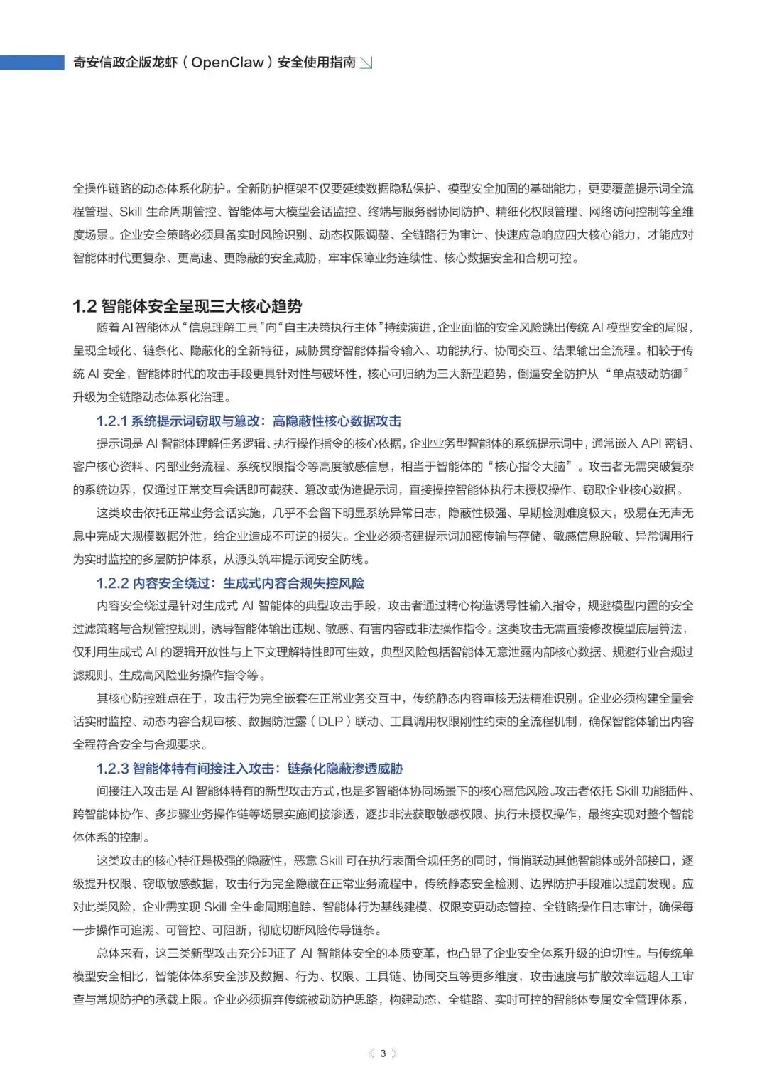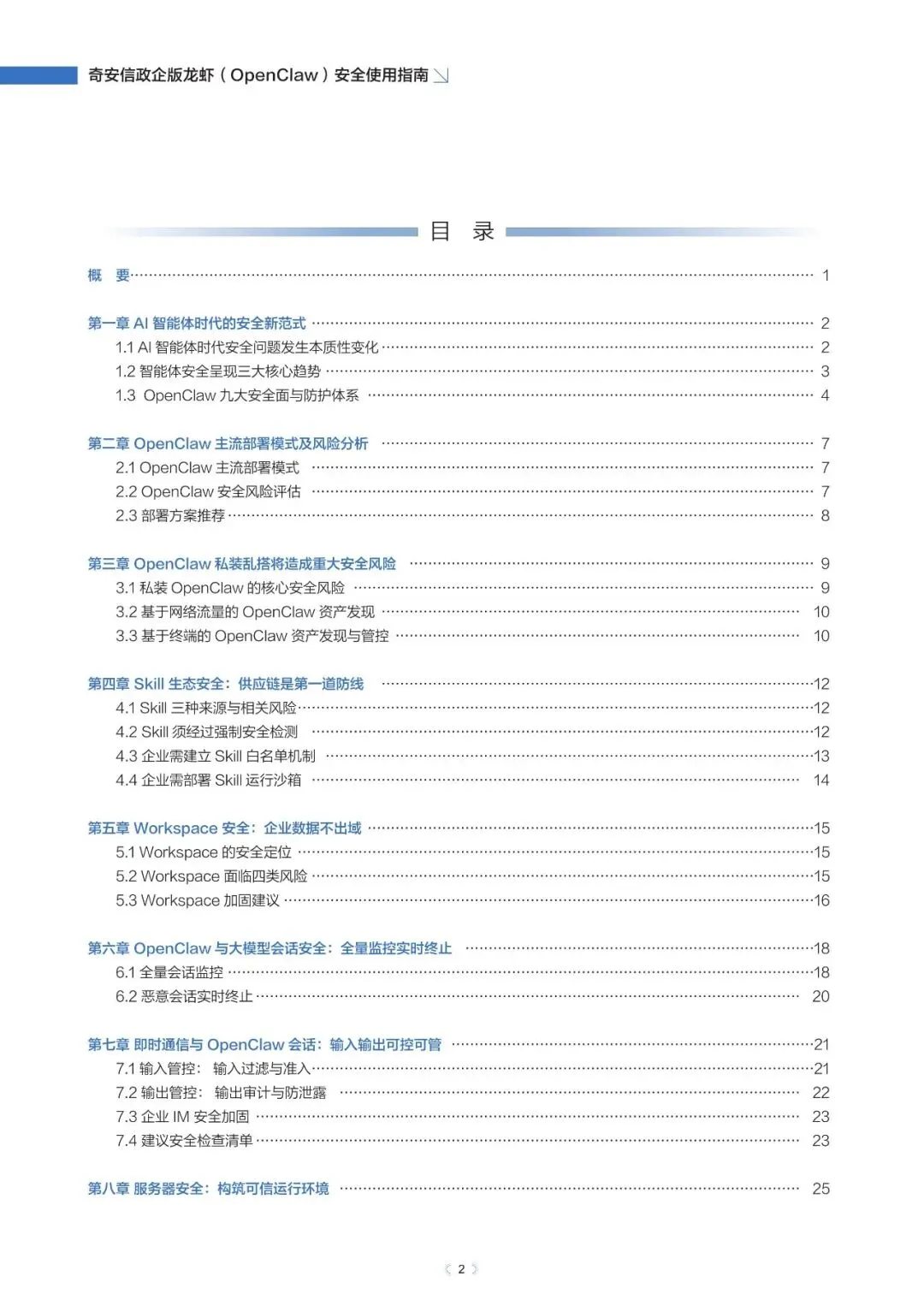 政企版龙虾OpenClaw安全使用指南(2026年)近日,奇安信发布《政企版龙虾(OpenClaw)安全使用指南》,为企业提供一套可落地的智能体安全治理方案,推动OpenClaw从“试点尝鲜”走向“规模化生产”,真正实现“看得清、管得住、用得好”。根据奇安信网络空间测绘数据,截至2026年3月13日,全球暴露在互联网的OpenClaw部署实例已超过23万,其中近9%存在已知漏洞风险。与传统网络攻击相比,针对智能体的攻击速度更快、可利用权限更高、传播更隐蔽。被操控的智能体可在数分钟内完成数据窃取、权限提升甚至业务篡改,而传统安全运营模式往往难以及时发现和响应。正是这些风险,让众多企业在AI智能体落地时望而却步。此次发布的指南就像一份“安全地图”,基于OpenClaw的技术架构与真实部署经验,系统梳理了智能体平台面临的九大关键风险,涵盖插件生态、数据空间、会话交互、网络连接等核心环节。指南明确建议:企业应优先采用私有化云端集中部署,避免在员工个人终端上运行核心智能体能力,从源头上确保安全策略统一执行,让智能体放心进入生产环境。部分内容:……篇幅原因,仅作部分展示如需获取文件,请前往知识岛扫码加入[XG云数智·知识岛]即可随时下载最新5G、6G、人工智能、数据产业资料!资料已上传每日持续更新随时随地查看↓↓↓投稿/商务咨询微信:simei5g亦可直接向公众号发送消息文章事宜请在本文下方留言
