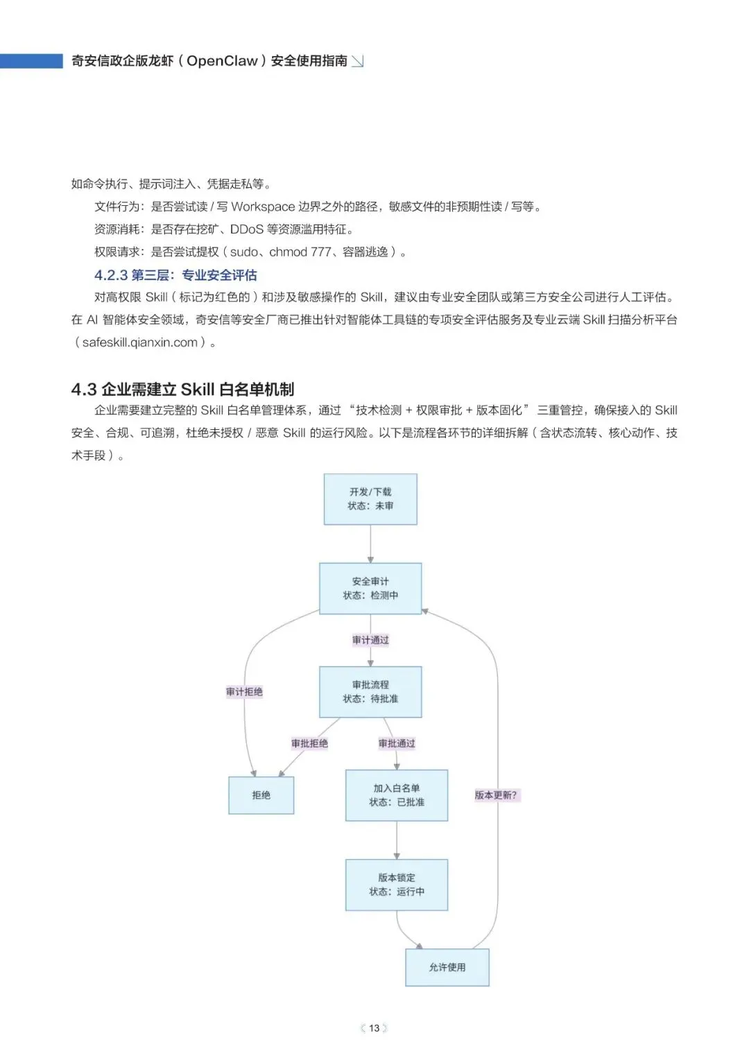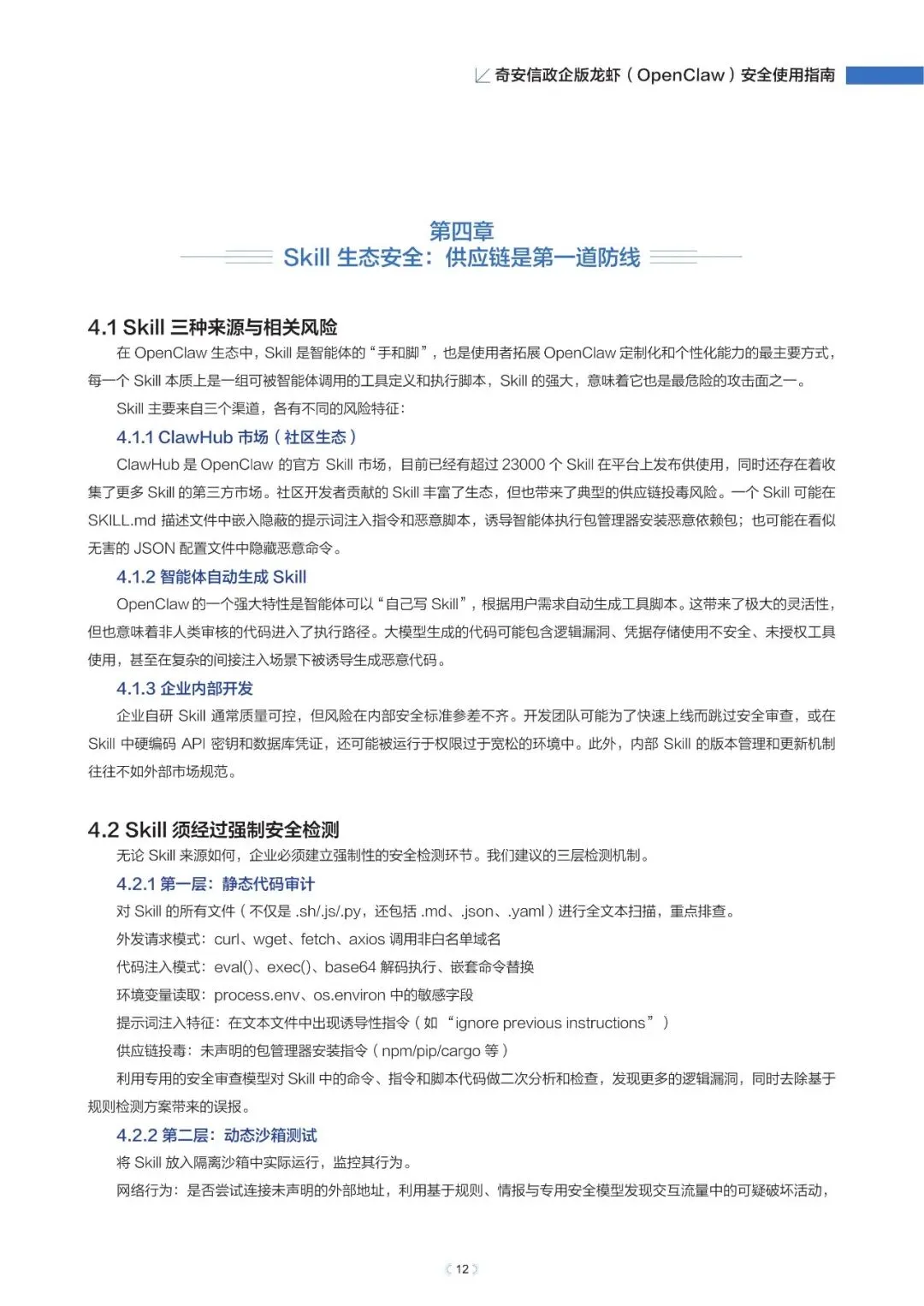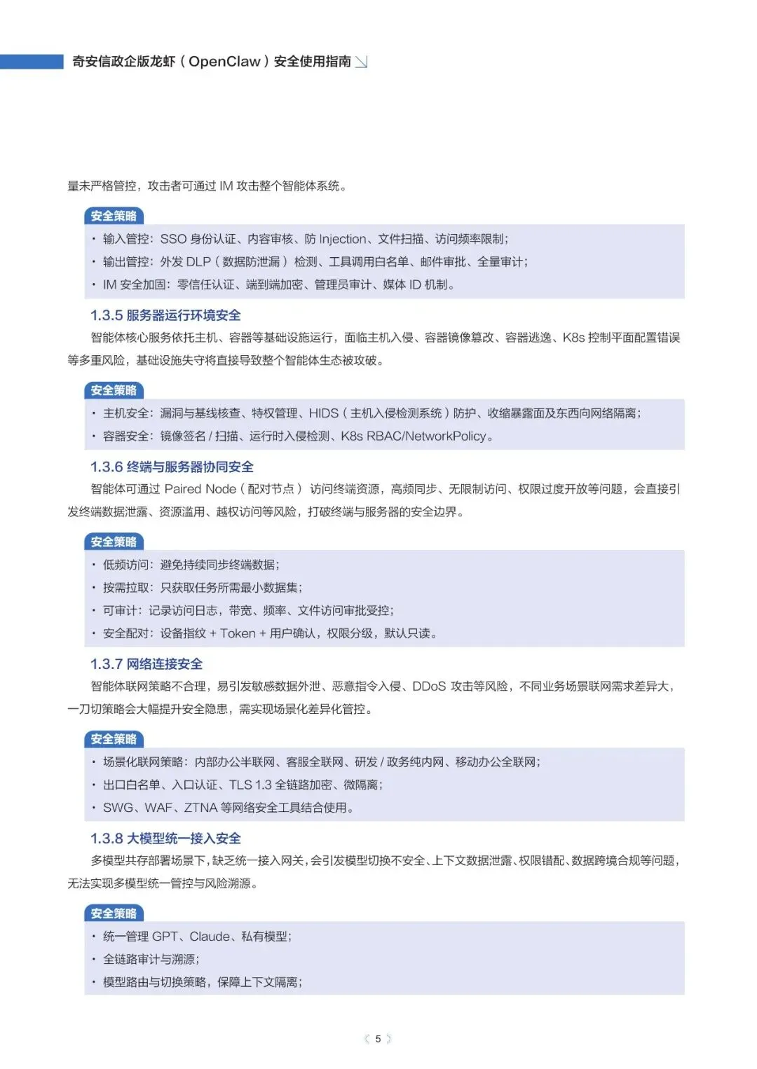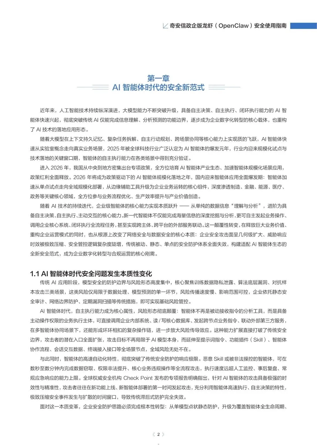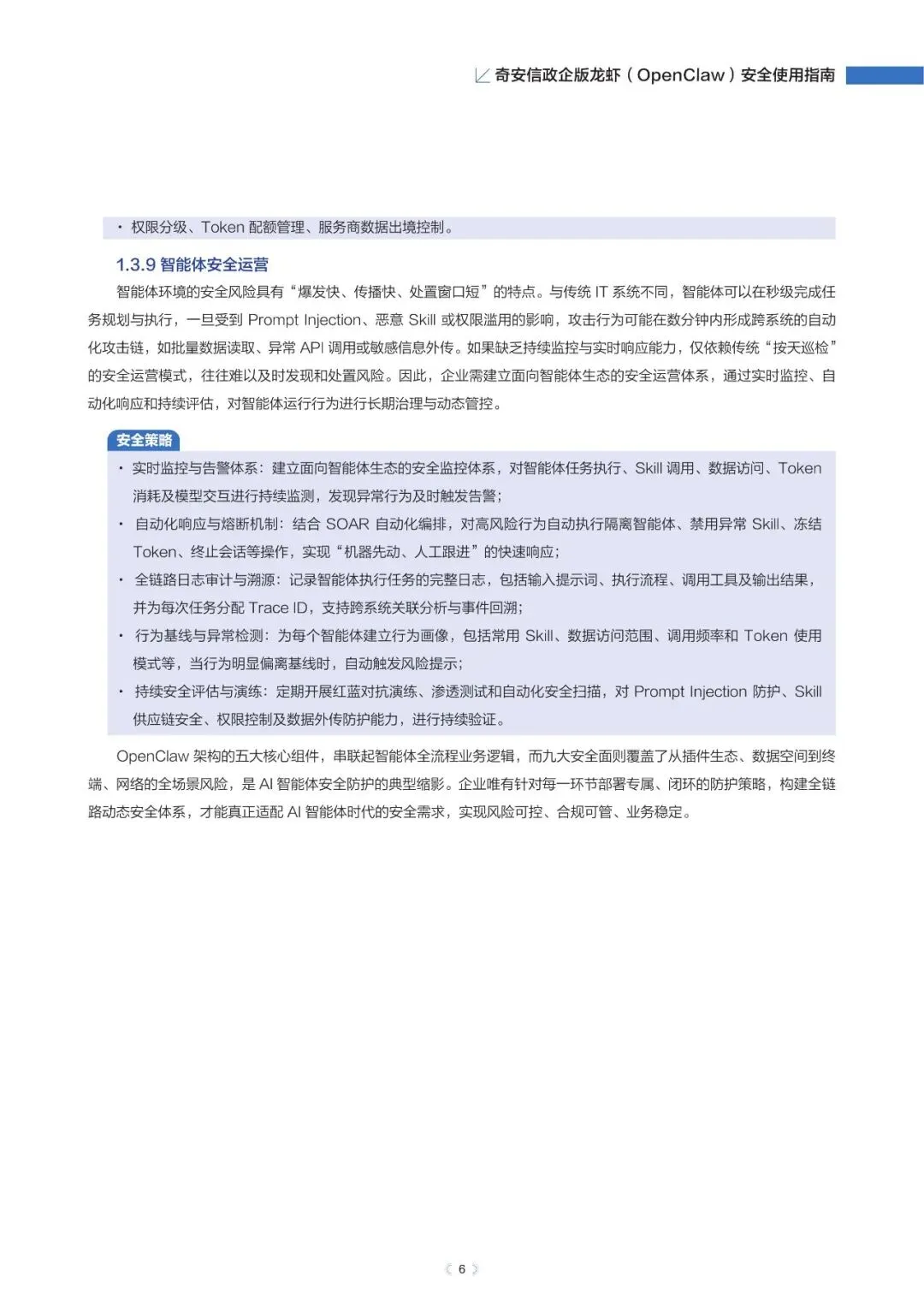 政企版龙虾OpenClaw安全使用指南(2026年)近日,奇安信发布《政企版龙虾(OpenClaw)安全使用指南》,为企业提供一套可落地的智能体安全治理方案,推动OpenClaw从“试点尝鲜”走向“规模化生产”,真正实现“看得清、管得住、用得好”。根据奇安信网络空间测绘数据,截至2026年3月13日,全球暴露在互联网的OpenClaw部署实例已超过23万,其中近9%存在已知漏洞风险。与传统网络攻击相比,针对智能体的攻击速度更快、可利用权限更高、传播更隐蔽。被操控的智能体可在数分钟内完成数据窃取、权限提升甚至业务篡改,而传统安全运营模式往往难以及时发现和响应。正是这些风险,让众多企业在AI智能体落地时望而却步。此次发布的指南就像一份“安全地图”,基于OpenClaw的技术架构与真实部署经验,系统梳理了智能体平台面临的九大关键风险,涵盖插件生态、数据空间、会话交互、网络连接等核心环节。指南明确建议:企业应优先采用私有化云端集中部署,避免在员工个人终端上运行核心智能体能力,从源头上确保安全策略统一执行,让智能体放心进入生产环境。部分内容:……篇幅原因,仅作部分展示如需获取文件,请前往知识岛扫码加入[XG云数智·知识岛]即可随时下载最新5G、6G、人工智能、数据产业资料!资料已上传每日持续更新随时随地查看↓↓↓投稿/商务咨询微信:simei5g亦可直接向公众号发送消息文章事宜请在本文下方留言