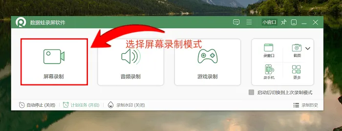 步骤1:怎么电脑录屏?先打开数据蛙录屏软件。进入主界面后,你会看到多种录制模式供你选择。今天我们主要讲解窗口录制模式,这种模式非常适合需要单独录制某个特定窗口内容的场景,比如微信对话框或浏览器页面,这样就不会将桌面上的其他内容也录制进去。