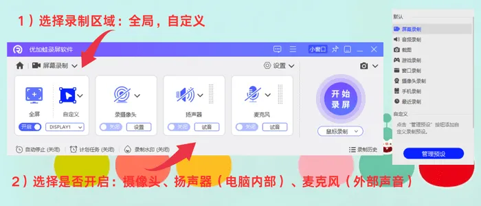 怎么电脑录屏幕视频?除了其他工具,优加蛙录屏软件同样值得一试,它支持七种主流录制模式,包括全屏、区域、游戏、应用窗口、摄像头以及单独录音。区域录制具备1像素精准定位能力,游戏模式经过引擎深度优化,可实现最高120FPS的高帧率录制。