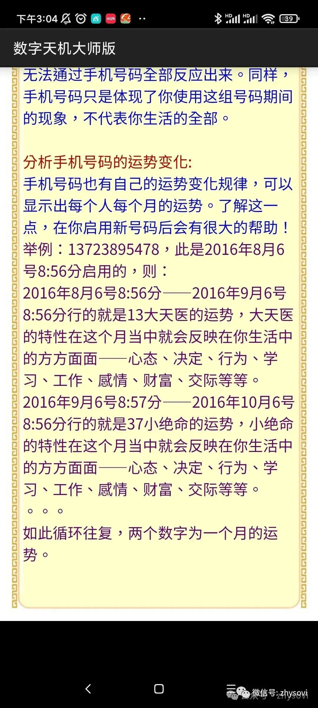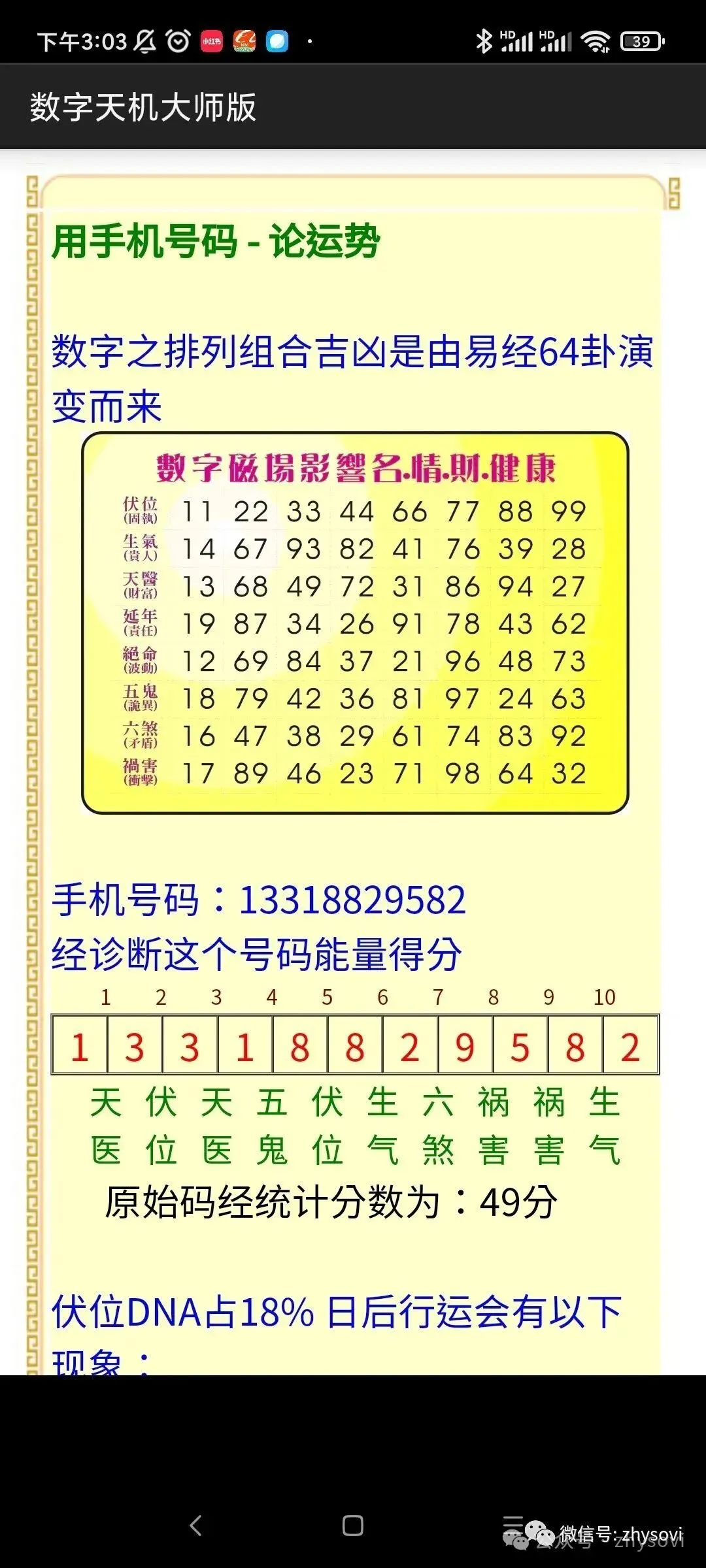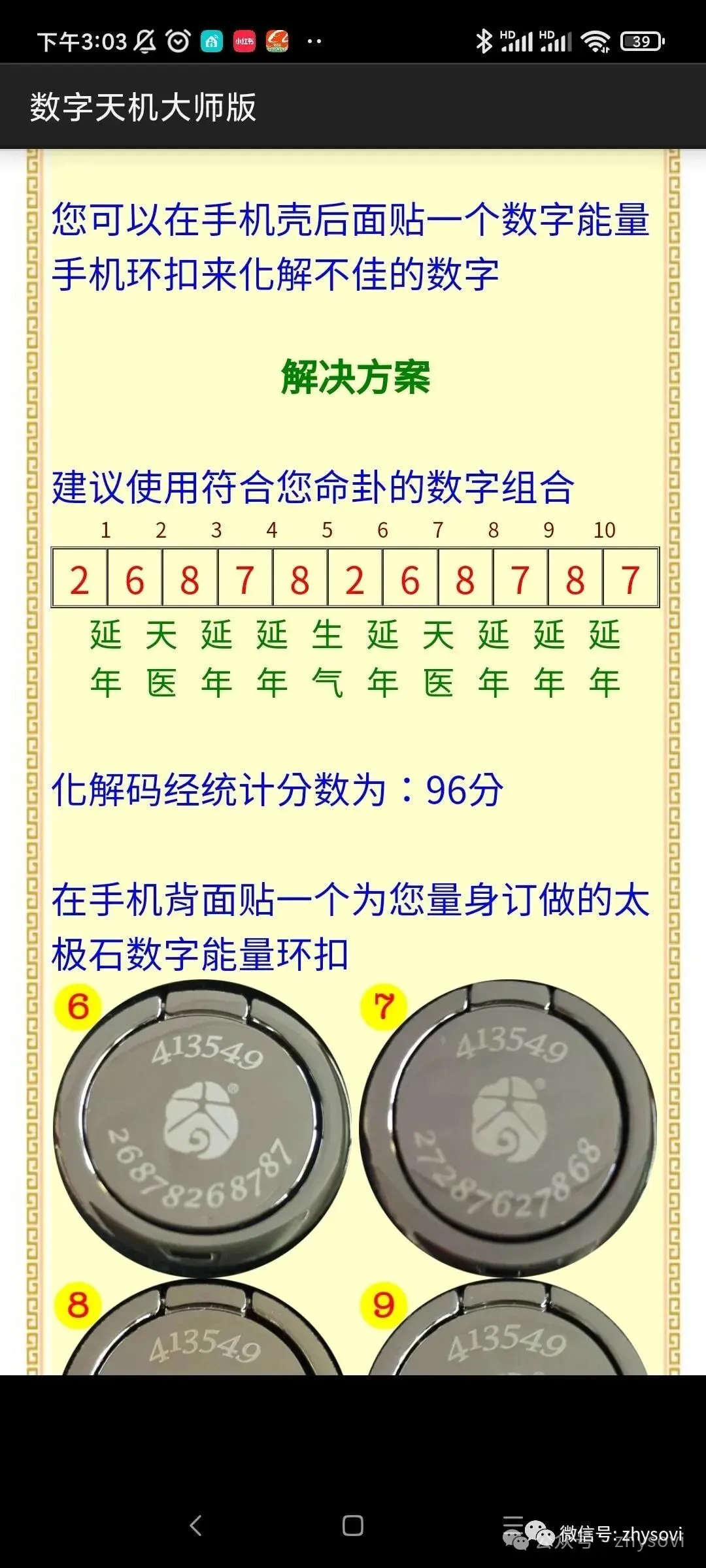 这是一款数字天机易学专业软件,非娱乐软件。 数字天机,关乎您的事业、财运、身体、学业、婚姻感情等吉凶祸福,如手机号码、身份证号、微信号码、QQ号码、汽车号牌、银行卡号、门牌号码、各类密码,都是有能量的。经过易学工作者上万次验证,是真实有效的。