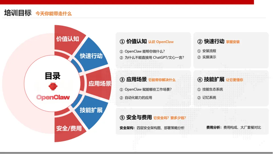一款优秀的企业级AI工具,不仅要能“干活”,还要能“持续成长”、“安全可控”。培训中,讲师分别从技能扩展和安全费用两大维度,讲解了如何让OpenClaw适配更多业务需求,以及如何保障工具使用的安全性和成本可控性。