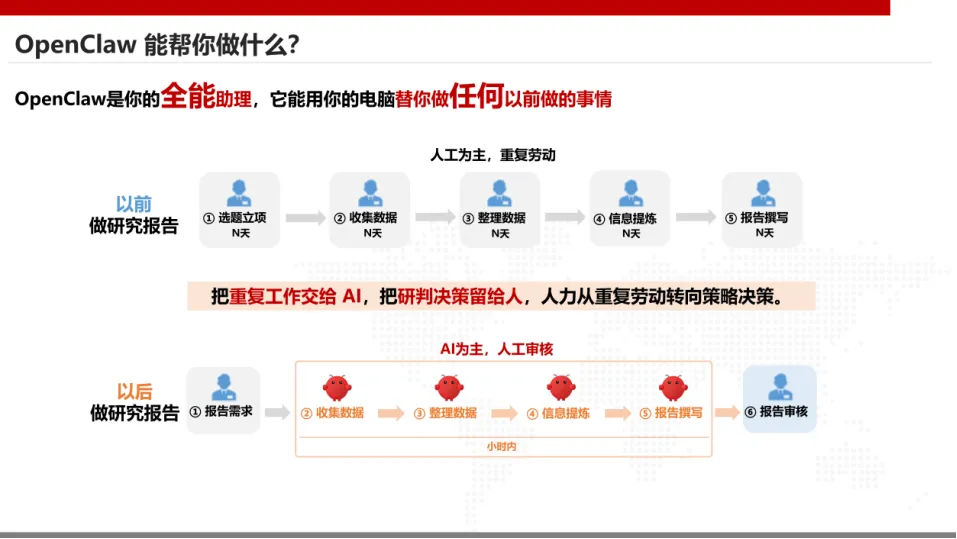 讲师以研究报告制作为典型案例,直观对比了传统人工流程与AI参与后的效率差异:传统模式下,从选题立项、数据收集整理到信息提炼、报告撰写,每个环节都需耗费数天时间,全程人工主导;而借助OpenClaw,只需提出报告需求,工具即可自动完成数据采集、整理、提炼、撰写等全流程工作,人工仅需完成最终审核,整个过程可在数小时内完成,效率提升数十倍。