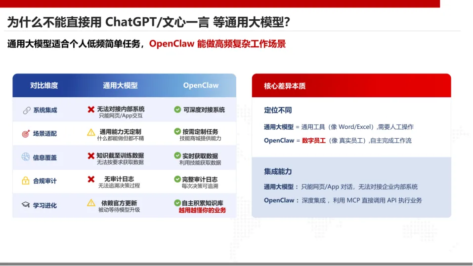 同时从系统集成、场景适配、信息覆盖、合规审计、学习进化五大维度解析其核心优势:可通过MCP直调API对接企业内部系统,依托ClawHub技能生态按需定制、适配各类场景,能实时获取数据突破知识截止限制,完整审计日志实现决策可追溯,还能自主积累知识库持续进化,是真正能为企业落地干活的AI智能体,而非单纯的聊天工具。
