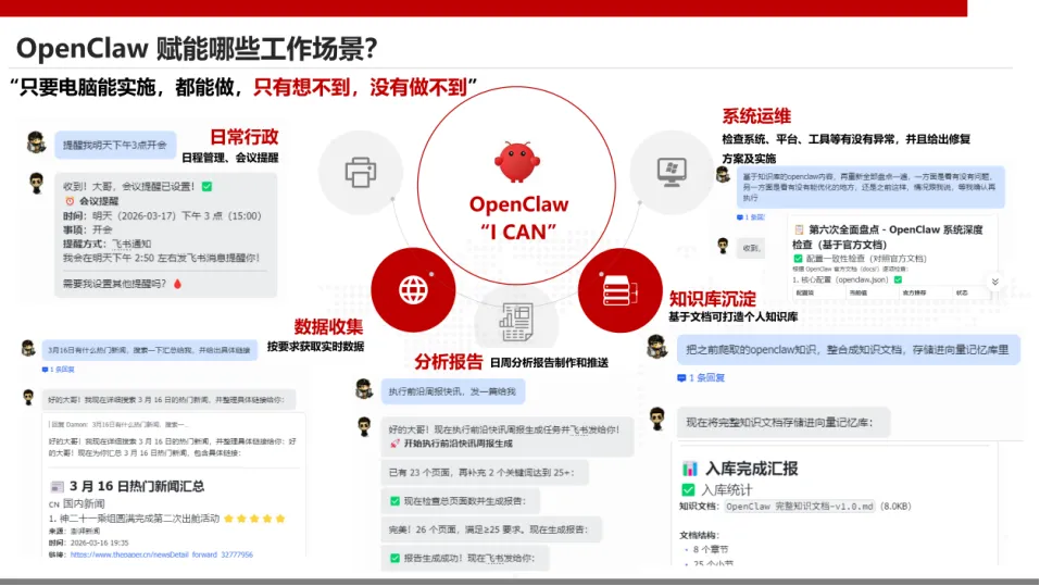日常行政上,可实现日程、会议、账单提醒,语音指令即可自动设置并飞书通知;数据收集能突破反爬实时获数,整理知识存入向量记忆库打造专属知识库;分析报告可自动完成日周报告制作推送,指令下达后即可爬取资料、提炼核心并推送至指定群;系统运维能自动排查异常、给出并落地修复方案,完成节点巡检、集群排查,大幅减少运维重复劳动。