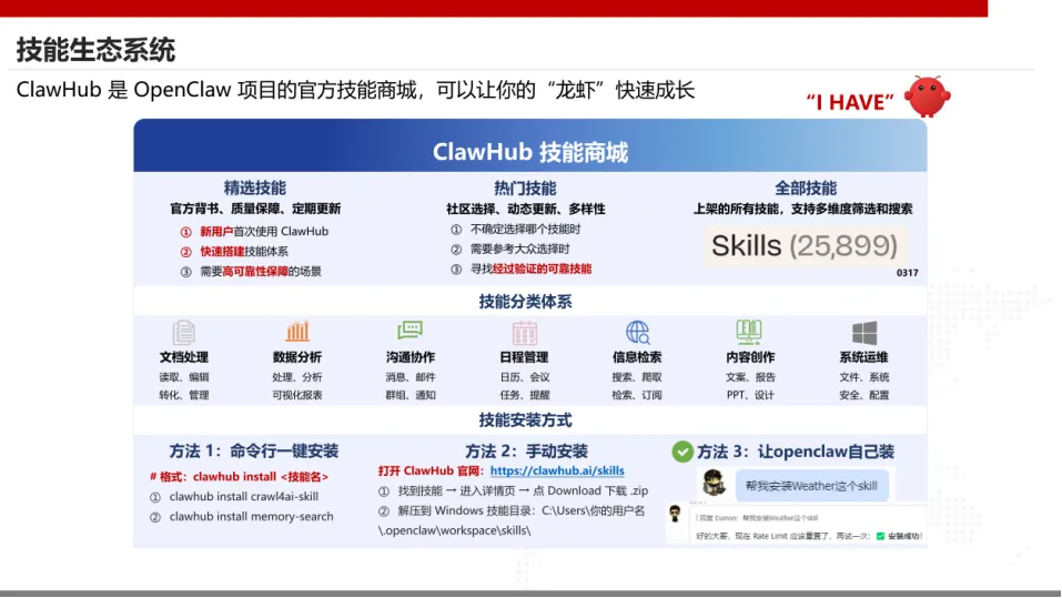 讲师介绍了OpenClaw官方技能商城ClawHub,平台有25899个上架技能,覆盖文档处理、数据分析等多领域,分精选、热门、全部三类可按需选择;还讲解了命令行一键安装、手动下载安装、工具自主安装三种技能安装方式,实现工具能力定制化扩展。此外,解析了工具的三层记忆架构,可自动保存关键信息,通过指令留存重要内容,解决通用大模型“健忘”问题,让工具越用越懂业务。
