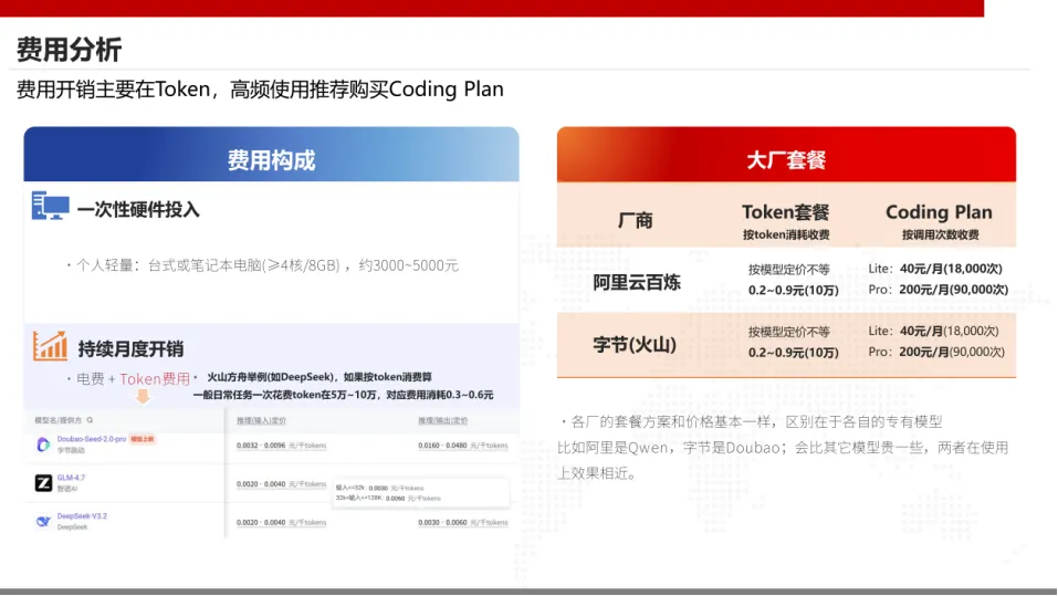 培训中展示了OpenClaw四层安全架构与三层独立防护体系,分析四种部署策略的安全评分和适用场景,其中“本地模型+本地服务器”安全等级最高,“云端模型+本地服务器”适配企业日常使用。同时拆解使用成本,由一次性硬件投入和电费+Token费用的月度开销构成,个人轻量硬件投入3000-5000元,Token费用可选择Token套餐或CodingPlan,大厂套餐定价统一,投入可控、性价比高。