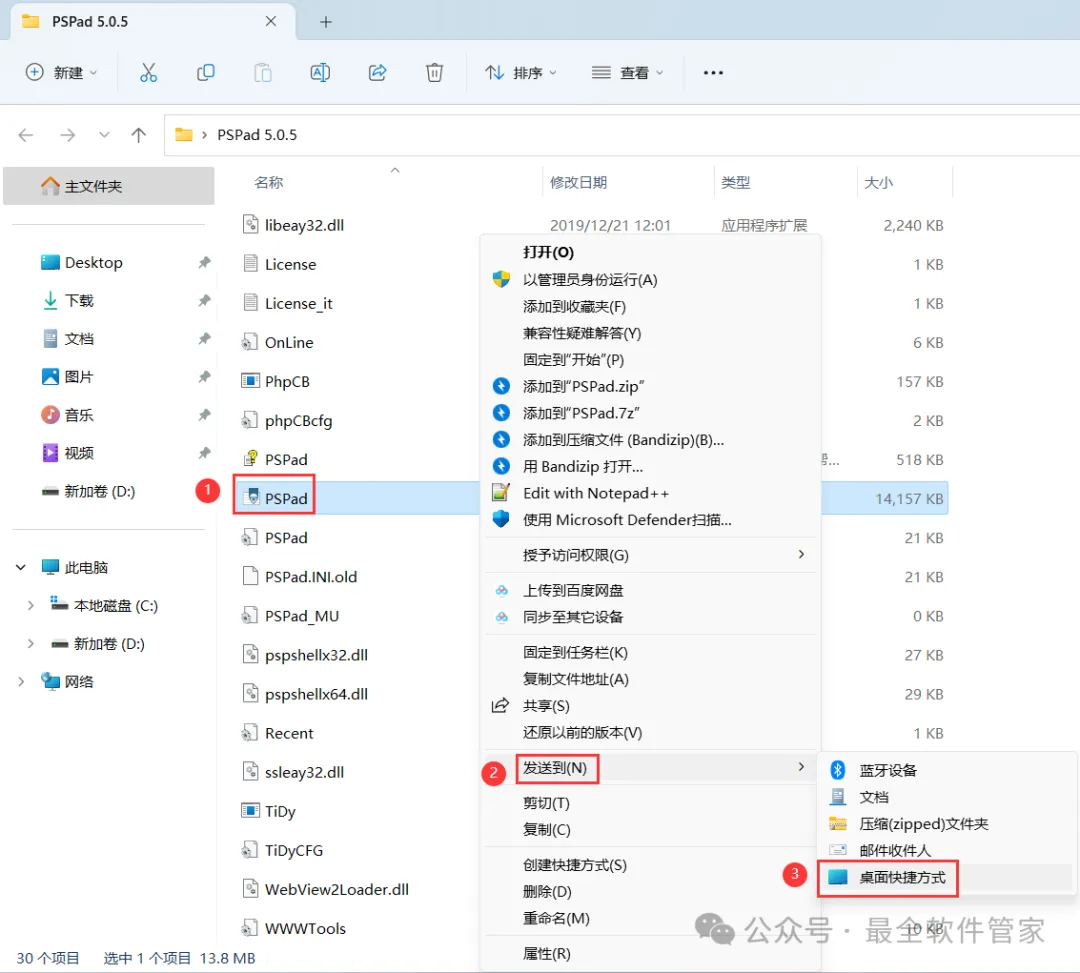 [不限速下载]:免费获取百度网盘不限速下载工具。公众号内回复:不限速[注意事项]:安装前请关闭网络、杀毒软件和防火墙,否则易安装失败。公众号内回复:1[解压软件]:小编用的解压软件是Bandizip,获取Bandizip软件安装包。公众号内回复:21、下载PSPad 5.0.5软件安装包到电脑上,右键选择【解压到PSPad 5.0.5\】3、找到【PSPad】应用程序,右键依次点击【显示更多选项】、【发送到】、【桌面快捷方式创建】,完成PSPad 5.0.5软件桌面快捷方式的创建4、回到桌面,右键桌面上的【PSPad软件图标】,点击【打开】6、以上就是PSPad 5.0.5软件安装的全过程,要是对你有帮助的话,请为小编点个赞!免责声明:软件资源均来源于网络,仅供用户交流学习与研究使用,版权归属原版权方所有,版权争议与本公众号无关,用户本人下载后不能用作商业或非法用途,否则后果均由用户承担责任;如果您访问和下载此文件,表示您同意只将此软件用于参考、学习而非其他用途,否则一切后果请您自行承担,请于下载后24小时内删除,不允许用于商业用途,否则法律问题自行承担。如果您喜欢该软件,请支持正版软件,购买注册,得到更好的正版服务。