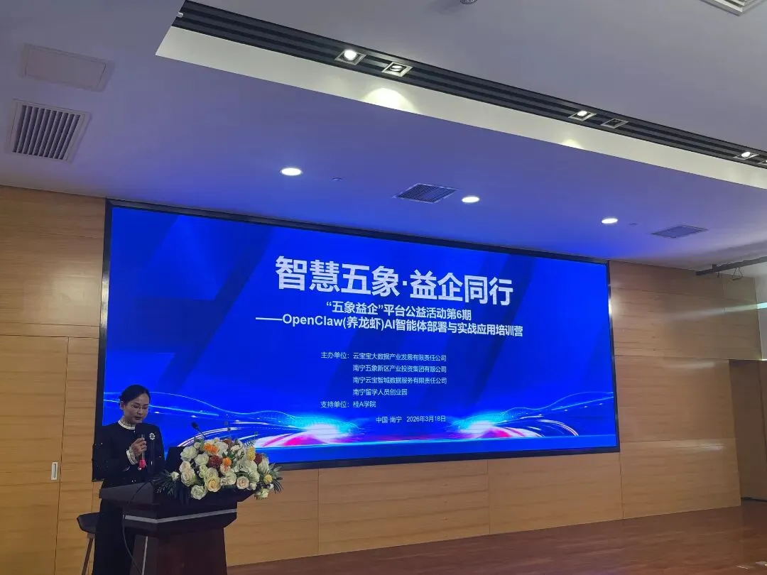 为助力企业抢抓数智化发展机遇,2026年3月18日,南宁五象新区产业投资集团有限公司(以下简称“五象产业集团”)联合云宝宝大数据产业发展有限责任公司、南宁云宝智城数据服务有限责任公司,在中国-东盟新型智慧城市协同创新中心成功举办“五象益企”公益活动第6期——OpenClaw (养龙虾)AI智能体部署与实战培训营。此培训共吸引南A东盟谷及相关领域50余个企业团队参与,实现前沿技术与企业需求的精准对接。