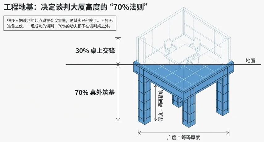很多人把谈判的起点设在会议室里,这其实已经晚了。一场成功的谈判,70%的功夫都下在谈判桌之外。不打无准备之仗,这句话在采购谈判中是绝对的真理。