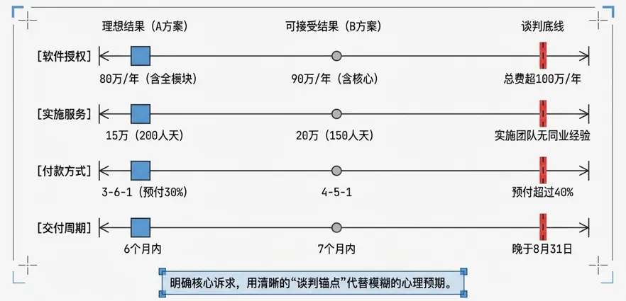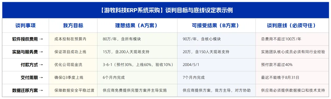 这里给你一个实用的工具,我们称之为“谈判目标与底线设定表”。以我们之前操盘的“游牧科技”公司采购新ERP系统为例: